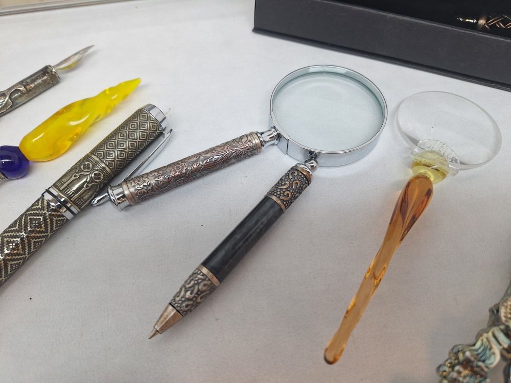 | Pennen/Schrijfwaren | Zware geëtste rollerball/vulpen (CG Your Messenger), veerpen (blauw) met metalen punt, 1x Aladine metalen pen, 1x metalen pen met steen, 1x metalen pen met geel glazen punt. |