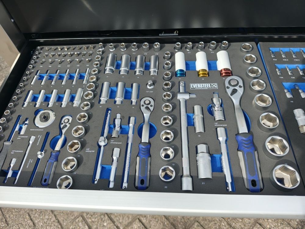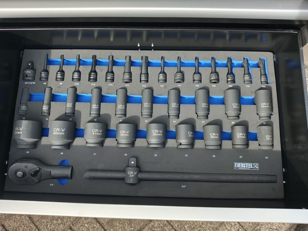 | Grote gereedschapswagen met zwaar gereedschap tot 50mm, incl krachtdoppen. Ongebruikt in doos |