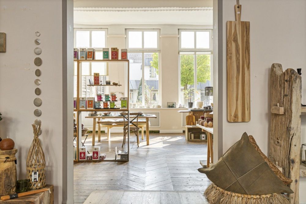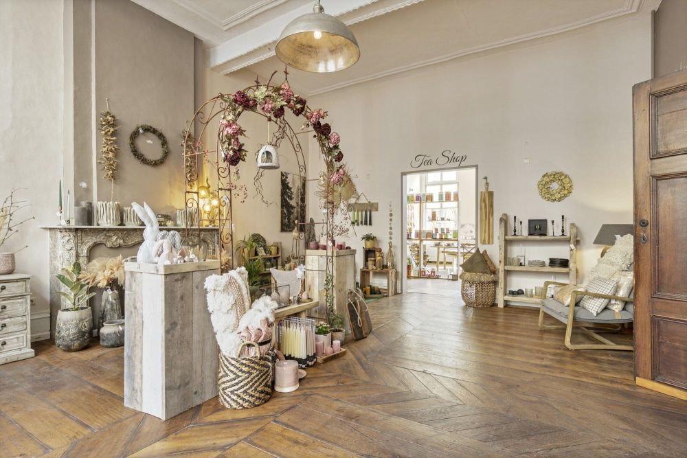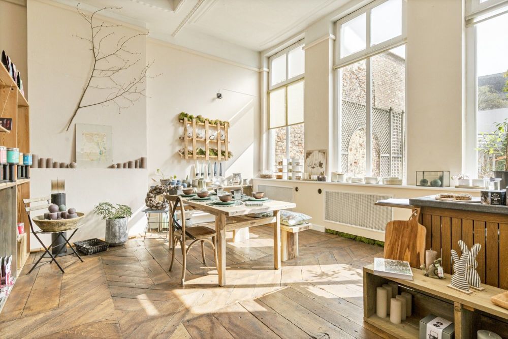 -een commerciële ruimte, gelijkvloers, van 135m2, een geklasseerde doorgang naar de binnentuin waarin een prachtige eiken antieke trap uitmondt