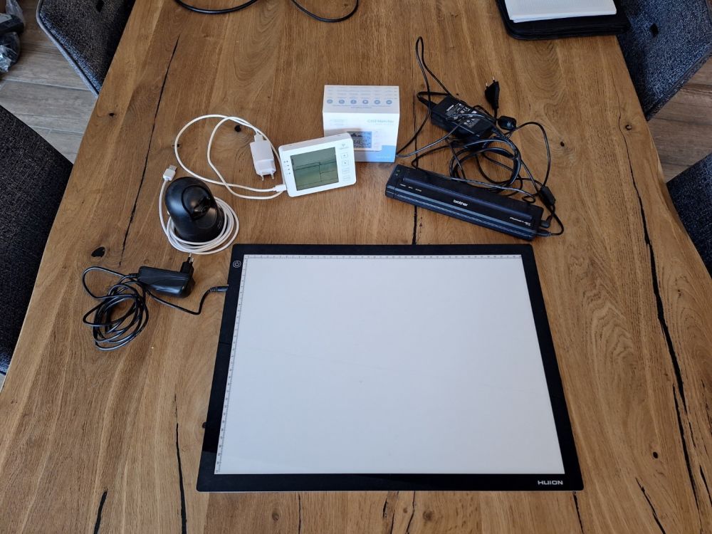 Huion lichtpad/lightbox voor tracing en illustratie,1 x Eufy Security indoor camera,1 x Digitale CO₂-monitor van het merk ROVARY, model RV200DP en 1 x Compacte mobiele printer van het merk Brother, model PocketJet PJ-723