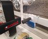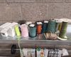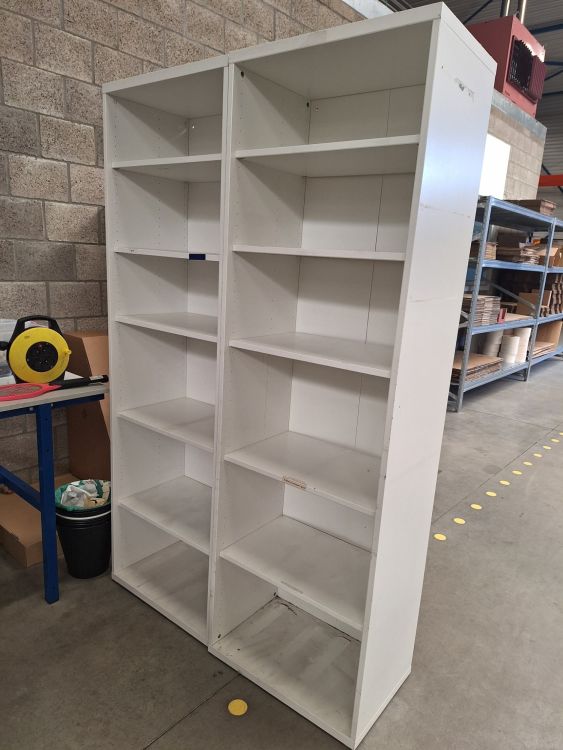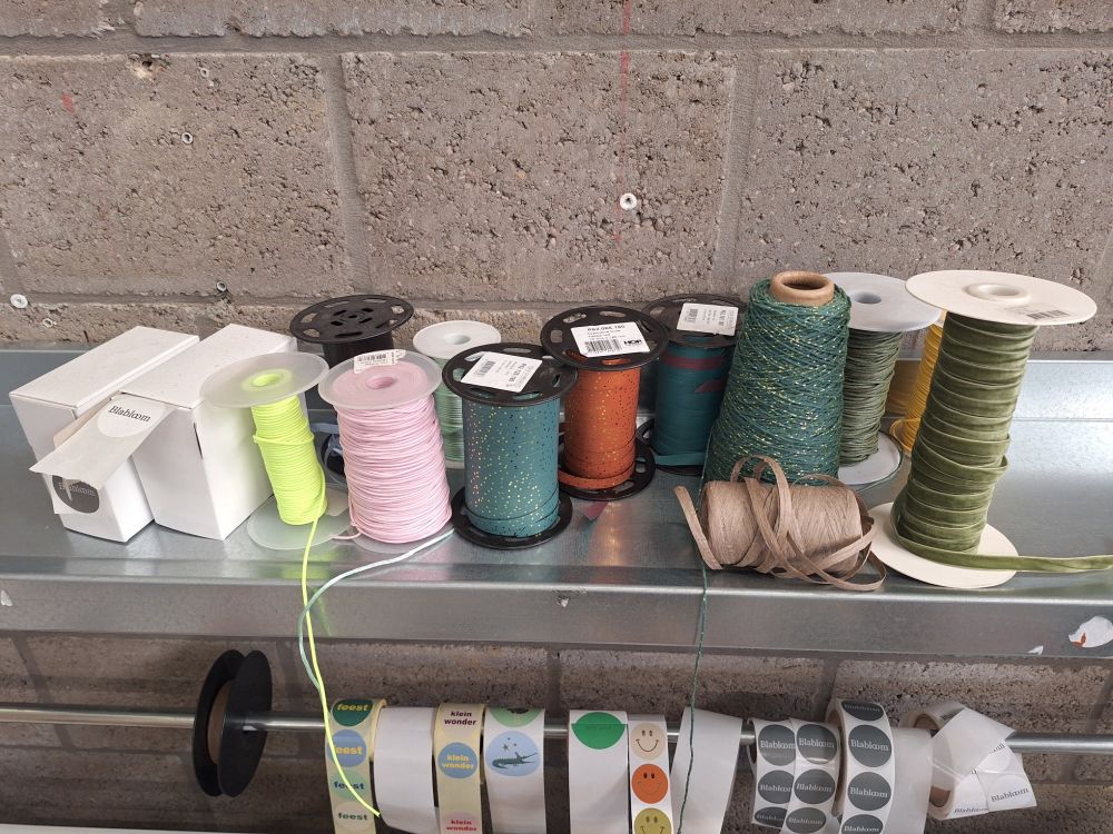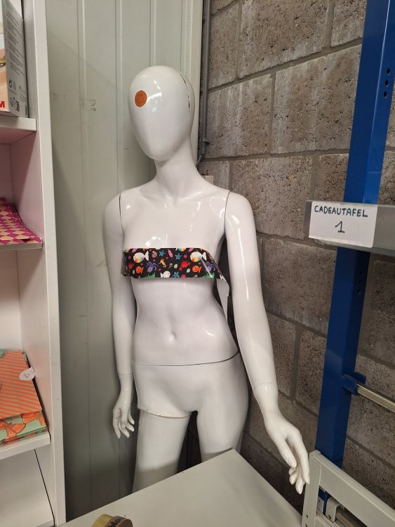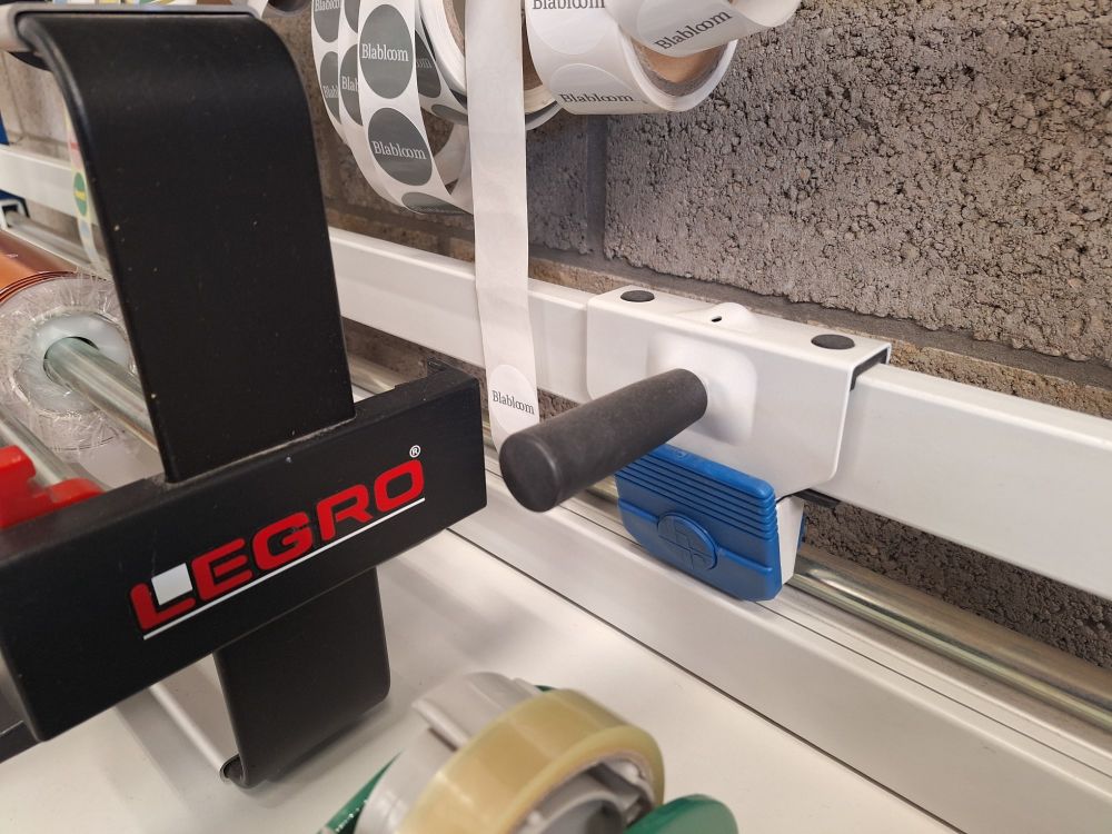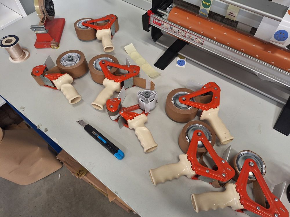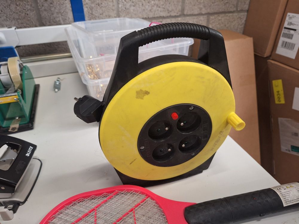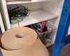 Tafel,paspop,verpakking,verlengsnoer op rol,witte kolomkasten,plakbandafrollers.