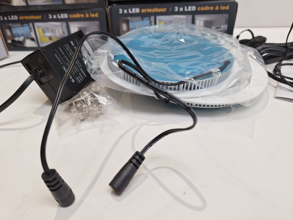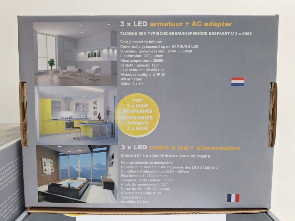 Inbegrepen per set: 3x LED armatuur, 1x AC-adapter, 3x 5 meter kabel, handleiding en bevestigingsklemmen.