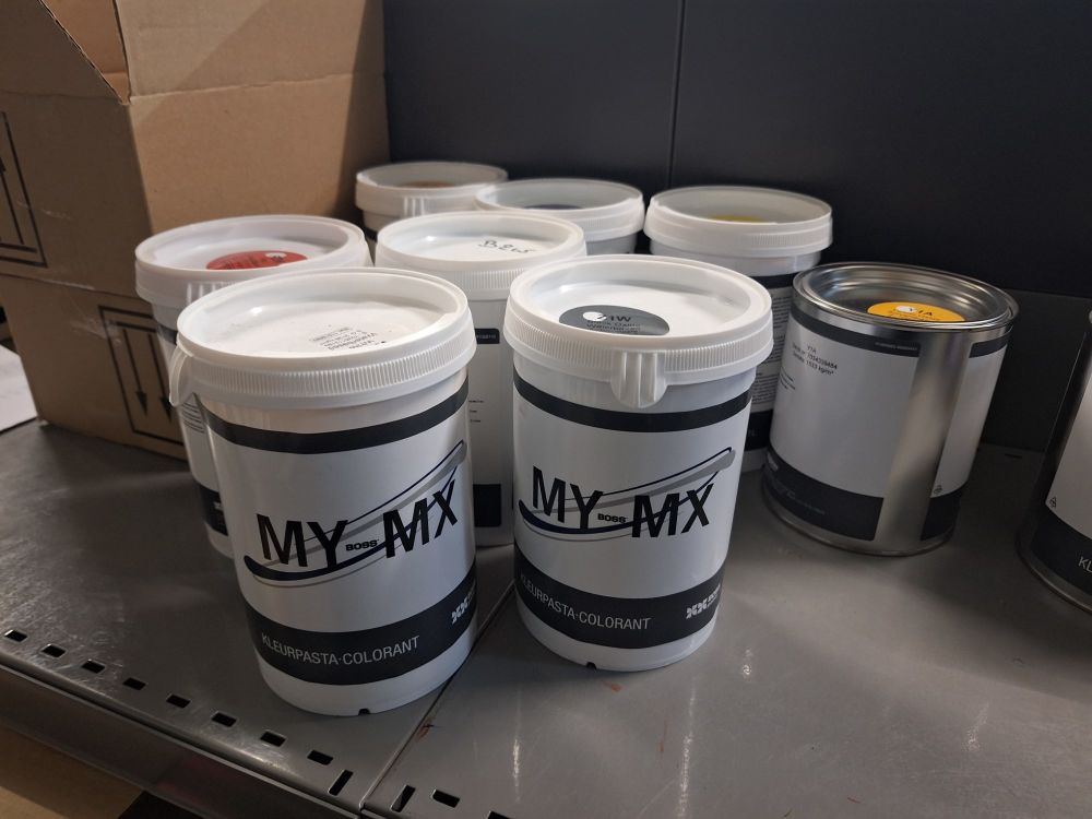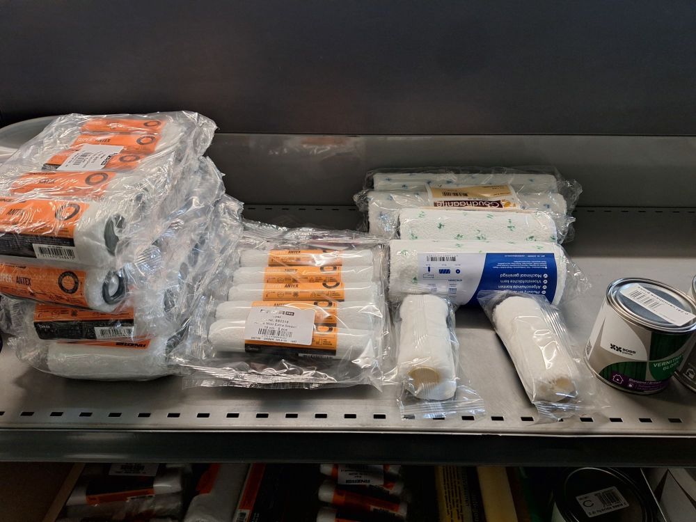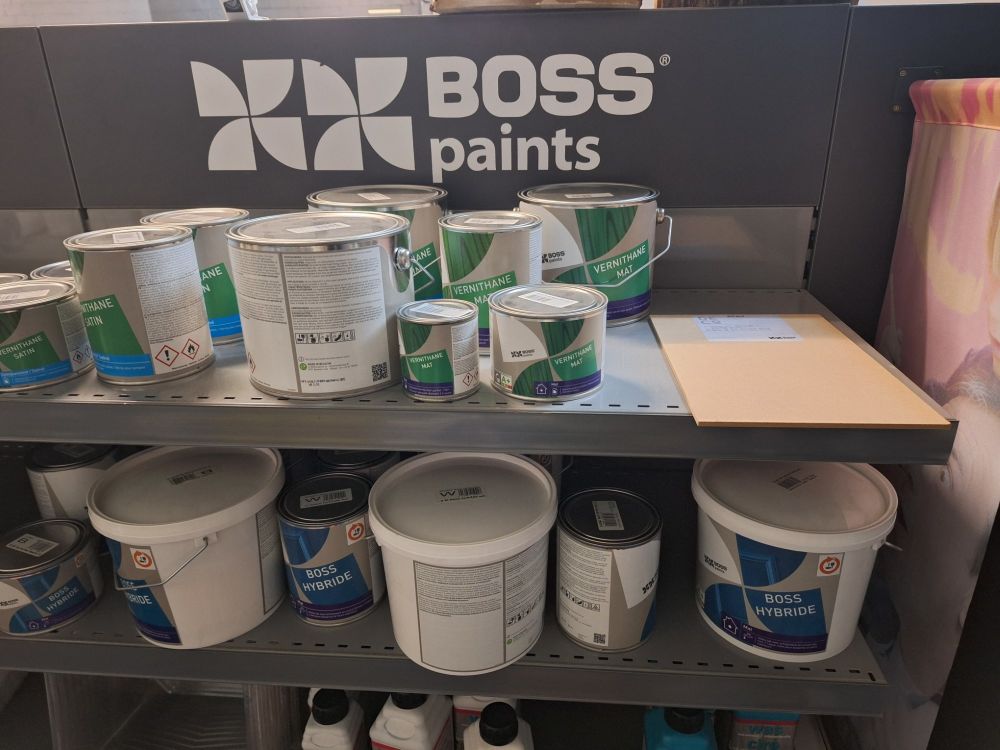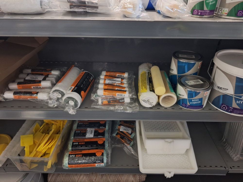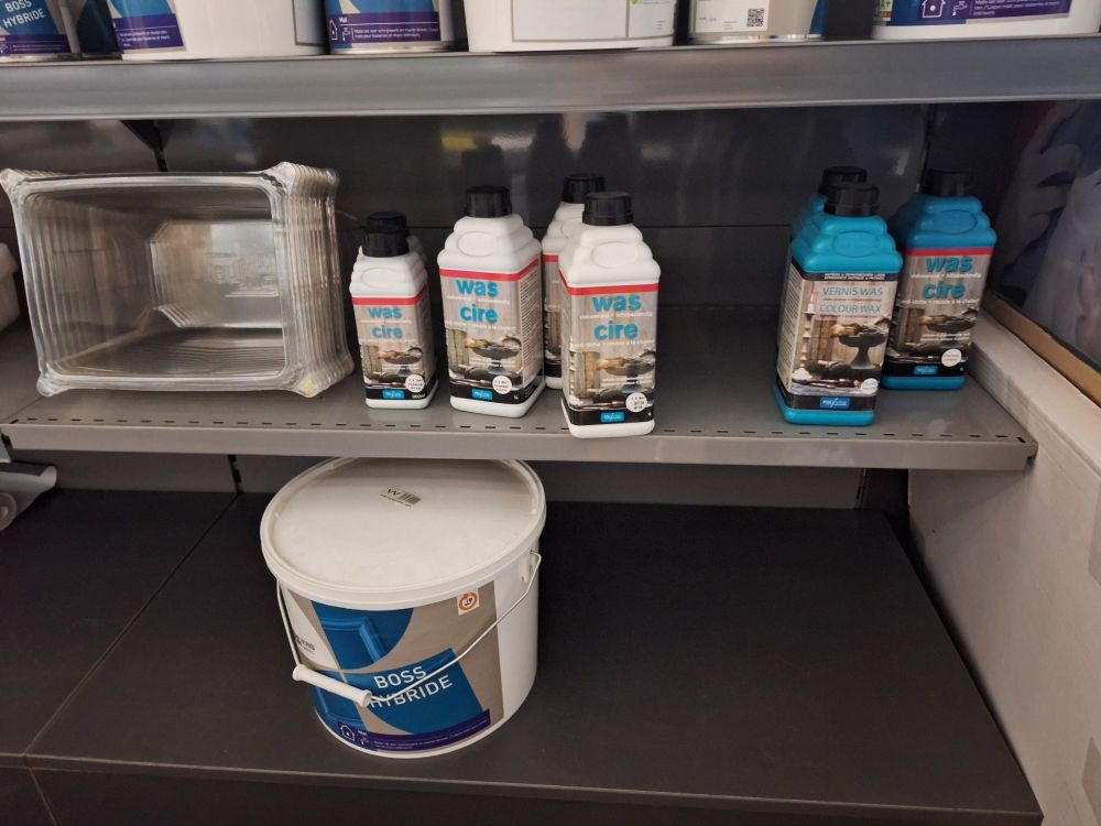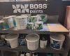 | Naam: | Lot Inhoud 4 lm winkelrek – diverse verven en vernis Boss,verfrollers,borstels en maatbekers |