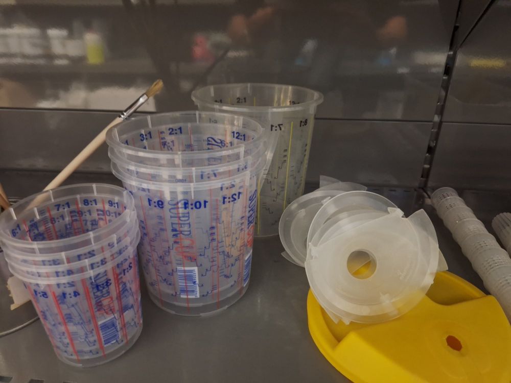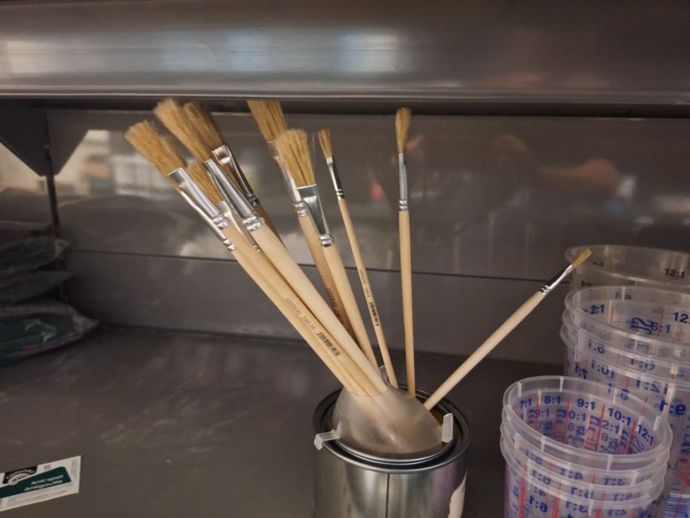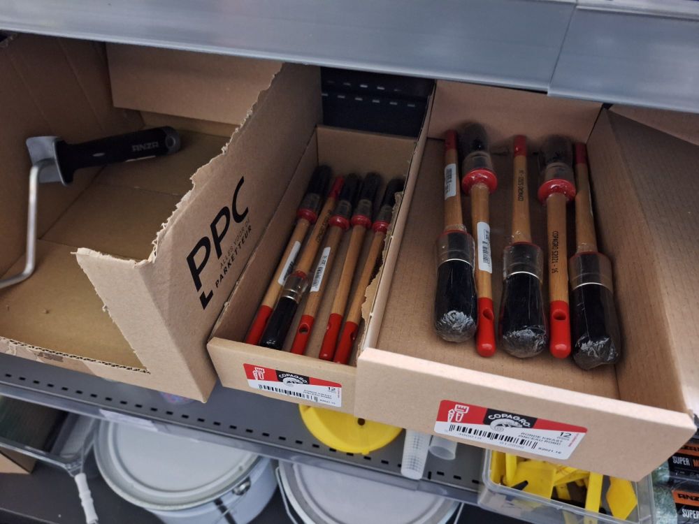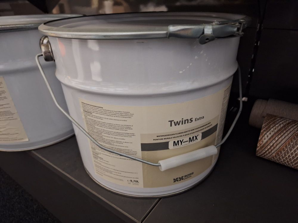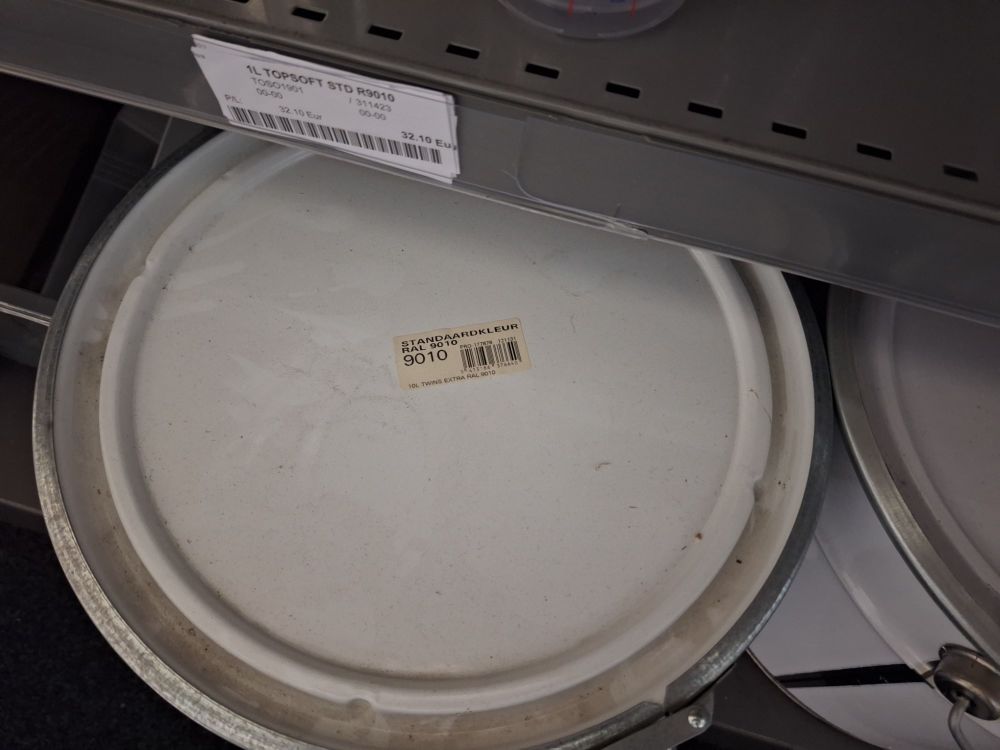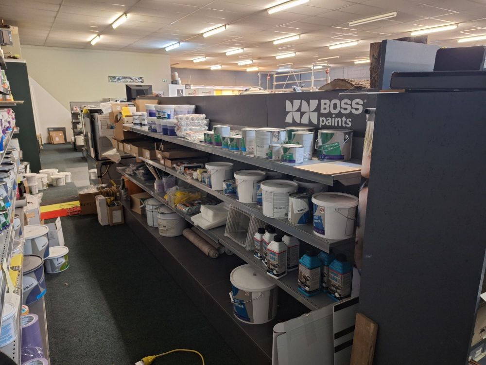 | Naam: | Lot Inhoud 4 lm winkelrek – diverse verven en vernis Boss,verfrollers,borstels en maatbekers |