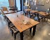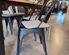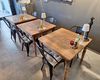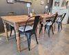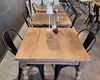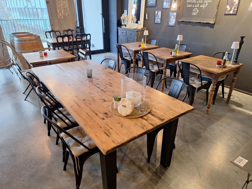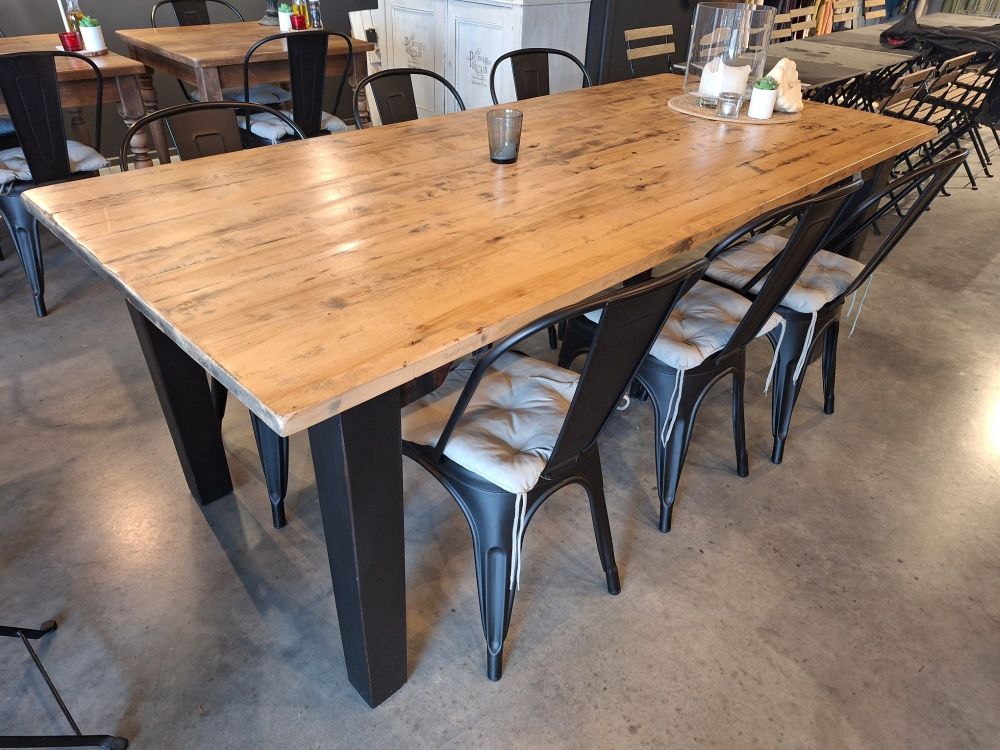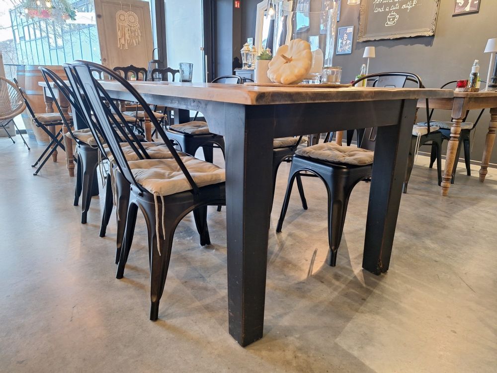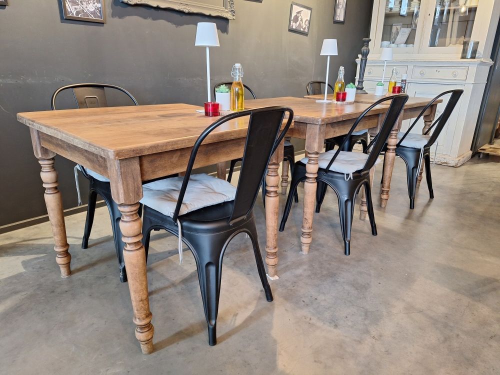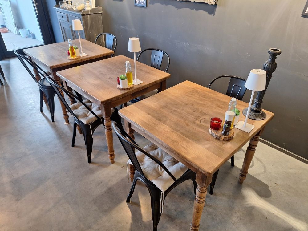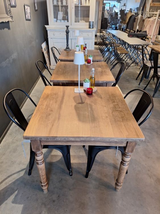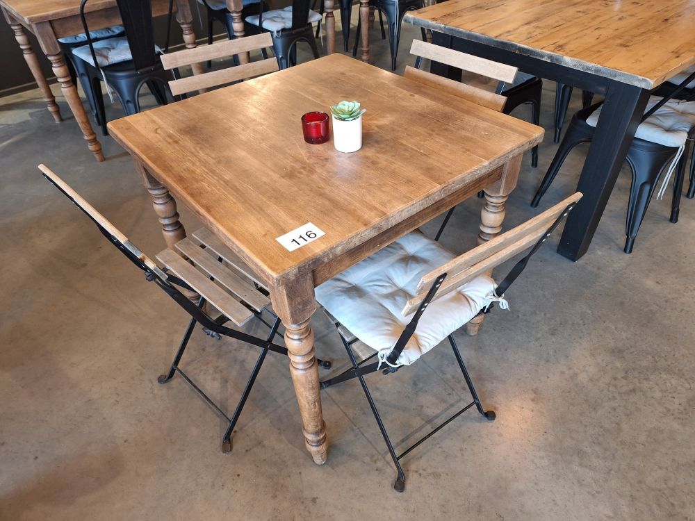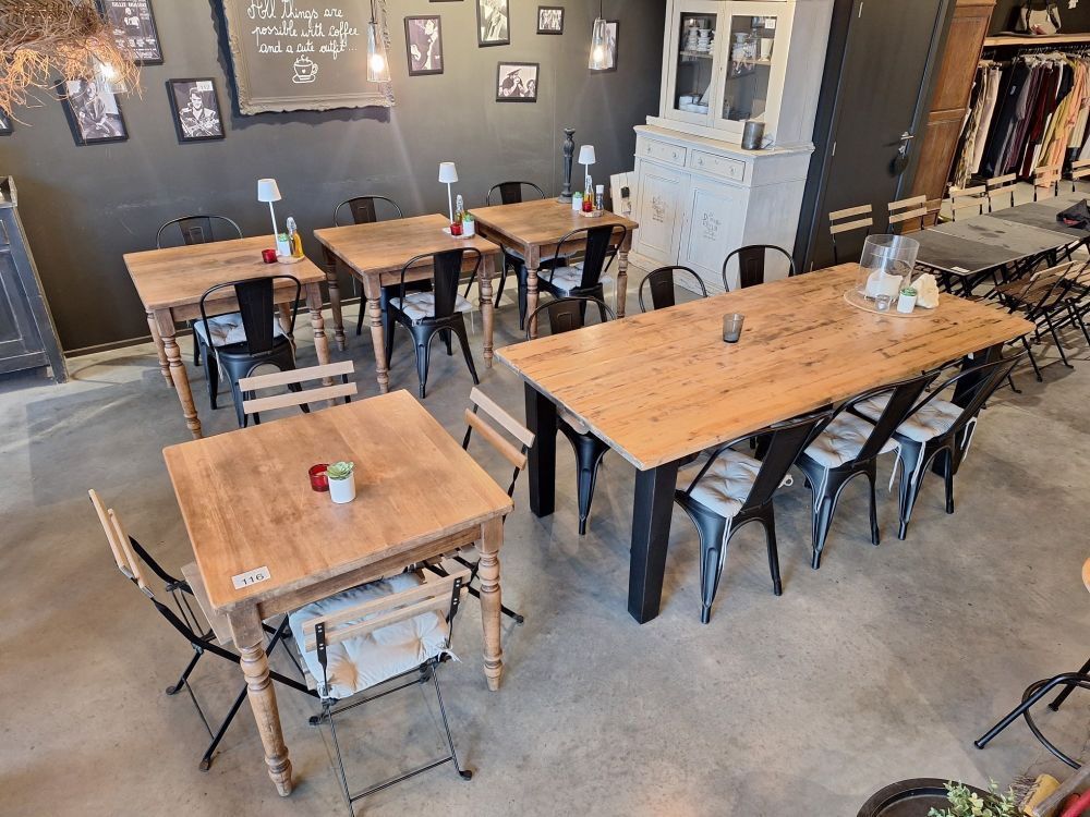 Inhoud van dit lot: meubilair en verlichting (4 vierkante houten tafels,1 rechthoekige tafel , 12 zwarte metalen stoelen , 4 opvouwbare bistro stoelen,3 glazen hanglampen en 3 tafel lampen)