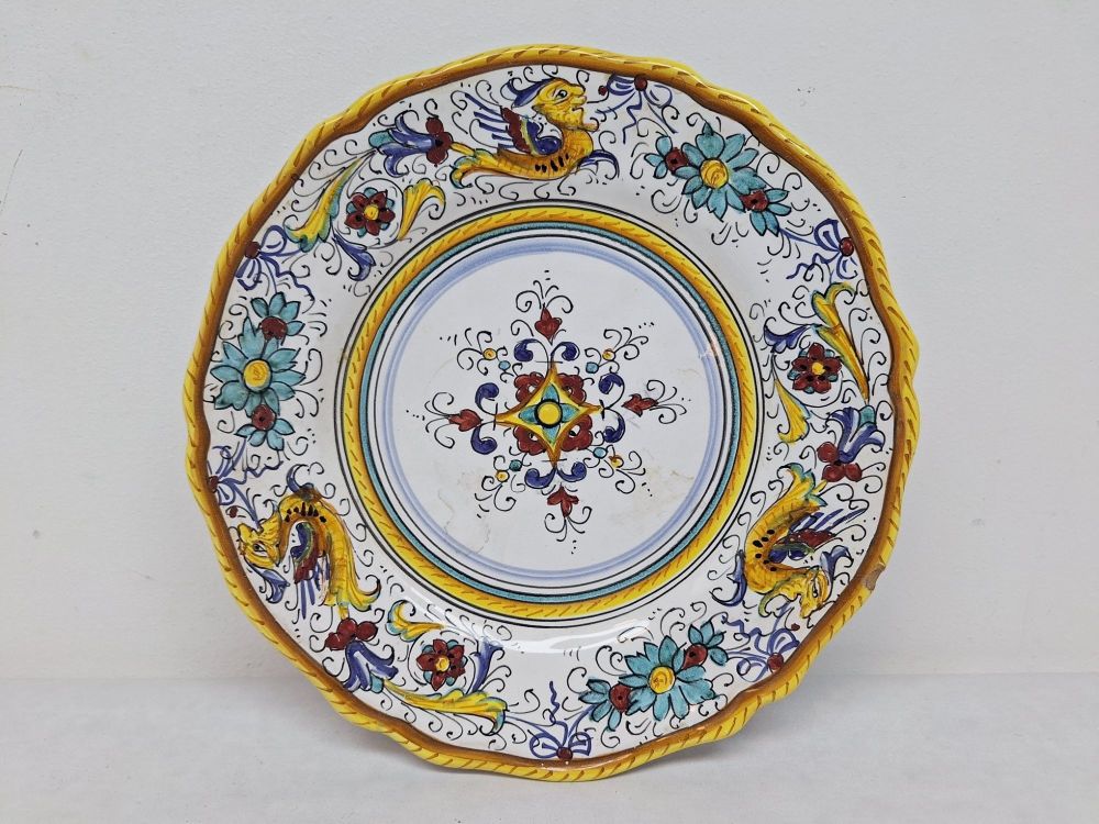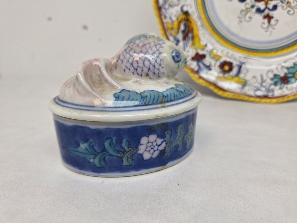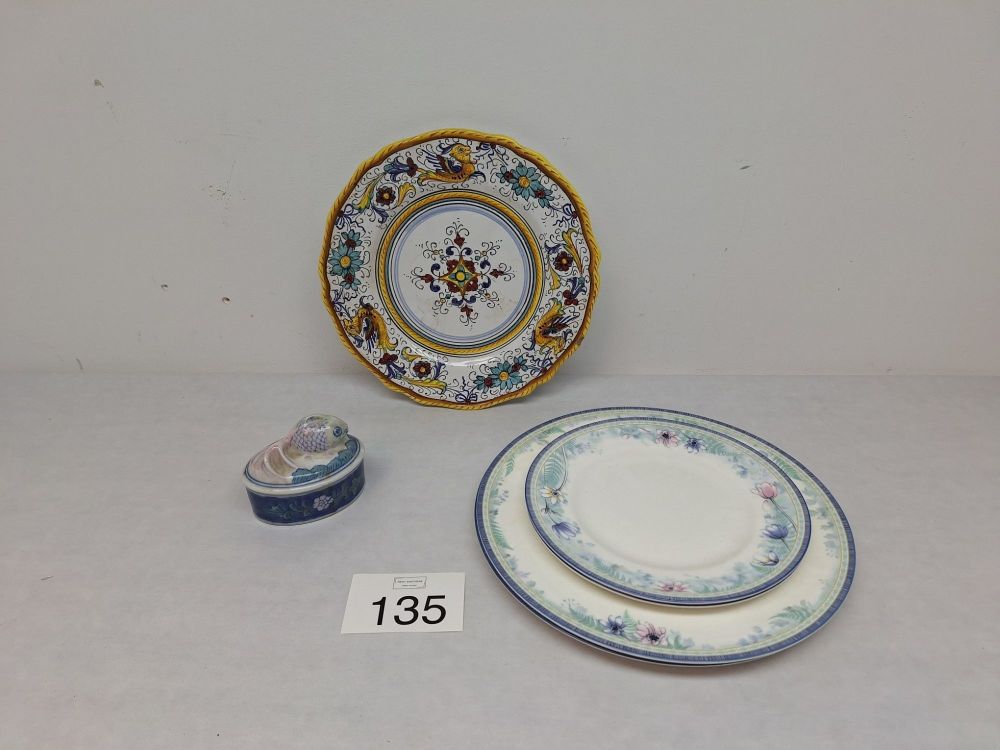 Een gevarieerd lot decoratief keramiek, bestaande uit drie items: een grote, handgeschilderde Italiaanse Raffaellesco geschulpte dinerbord; een set van twee Wedgwood Bone China borden (patroon 'Delphina', 1998); en een kleine Chinees-geproduceerde blauw-witte keramische doos met een driedimensionale vis op de deksel.