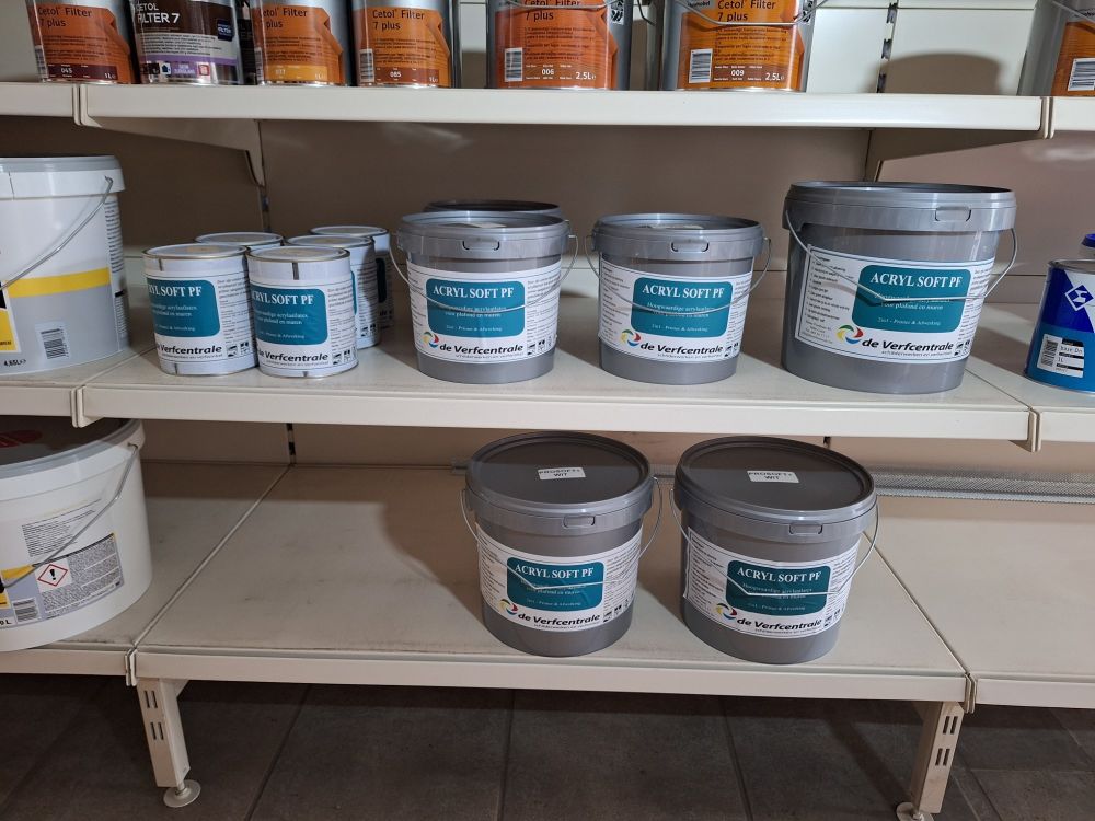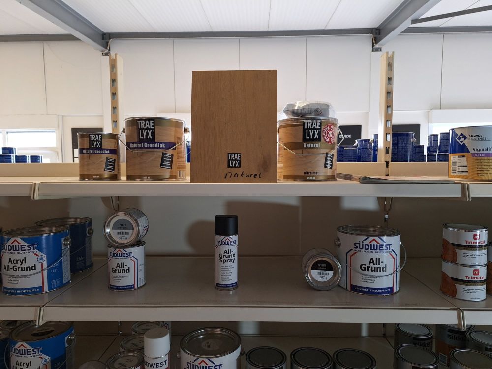 Gevarieerd lot verfproducten, primers en houtbehandelingen – het betreft enkel de inhoud van het gemarkeerde rek, niet het rek zelf.