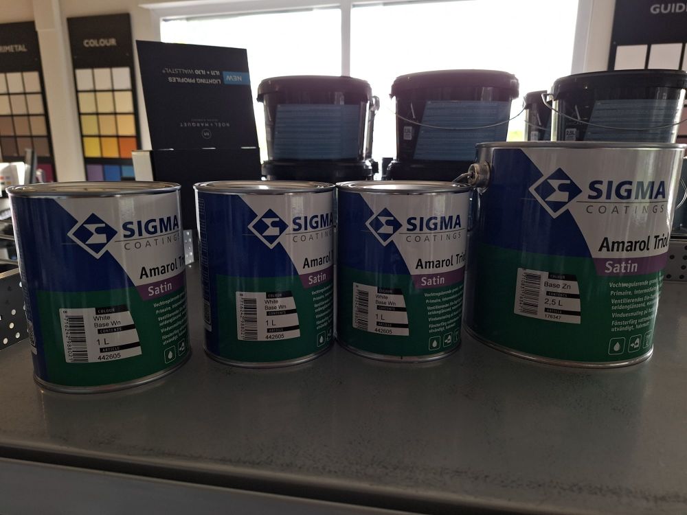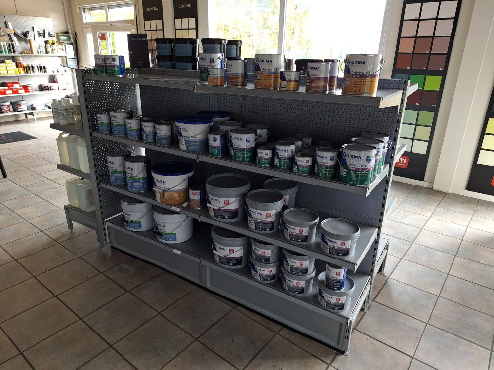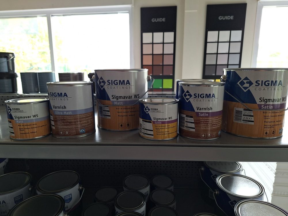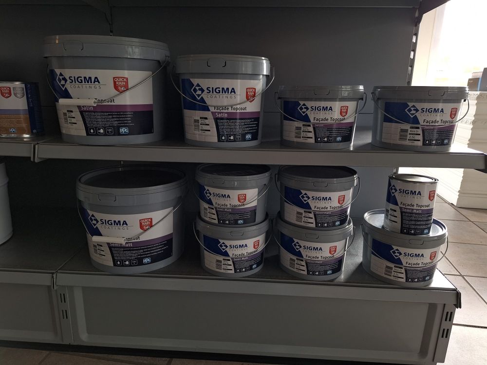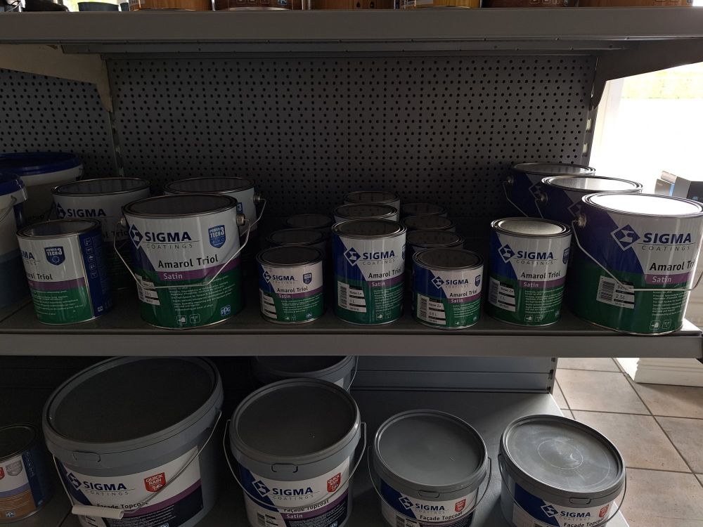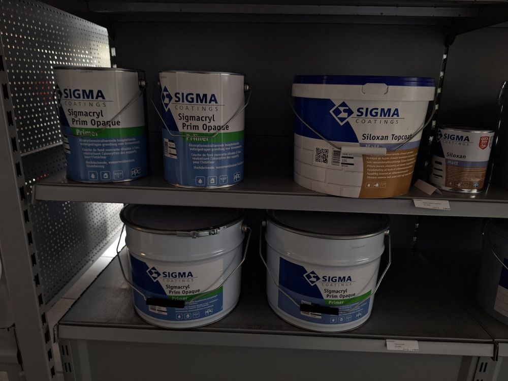 Gevarieerd lot SIGMA Coatings verfproducten – het betreft enkel de inhoud van het rek, niet het rek zelf.
