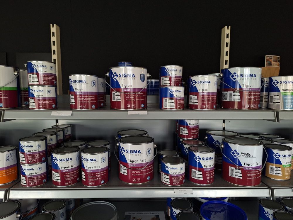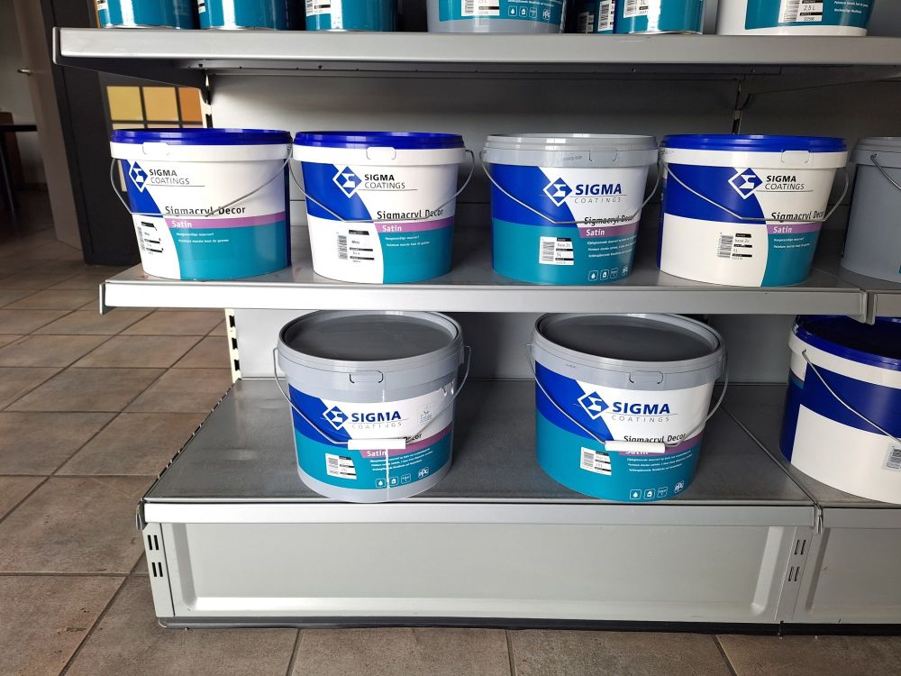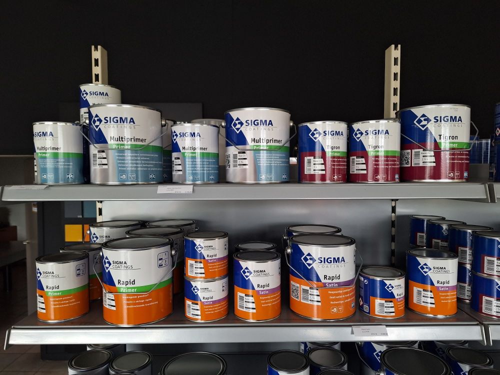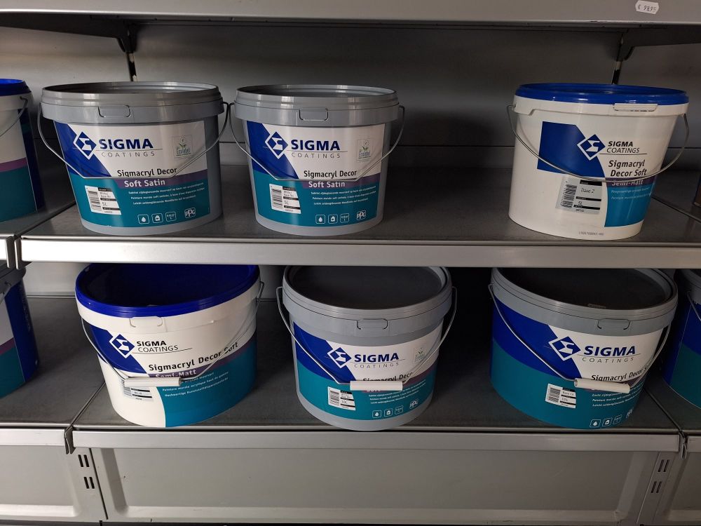 Gevarieerd lot SIGMA Coatings verfproducten – het betreft enkel de inhoud van het rek, niet het rek zelf.