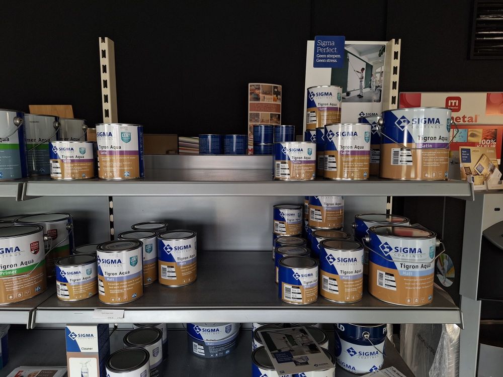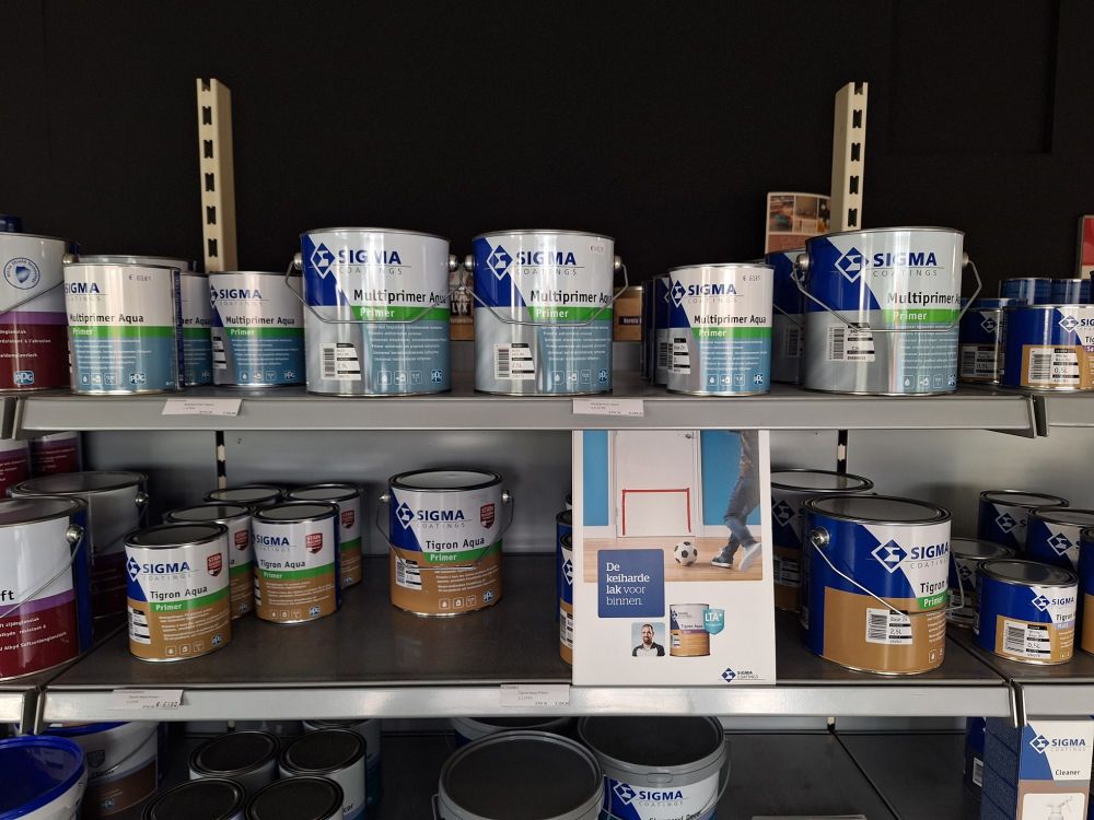 | Naam: | Lot SIGMA verfproducten – primers, lakken, muur- en gevelverf (enkel inhoud rek) |