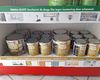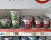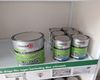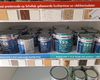 1 x metalen demo standaard met 4 leggers “Zinsser”100x47x180cm gevuld met diverse blikken verven voor verschillende ondergronden 60tal blikken en spuitbussen