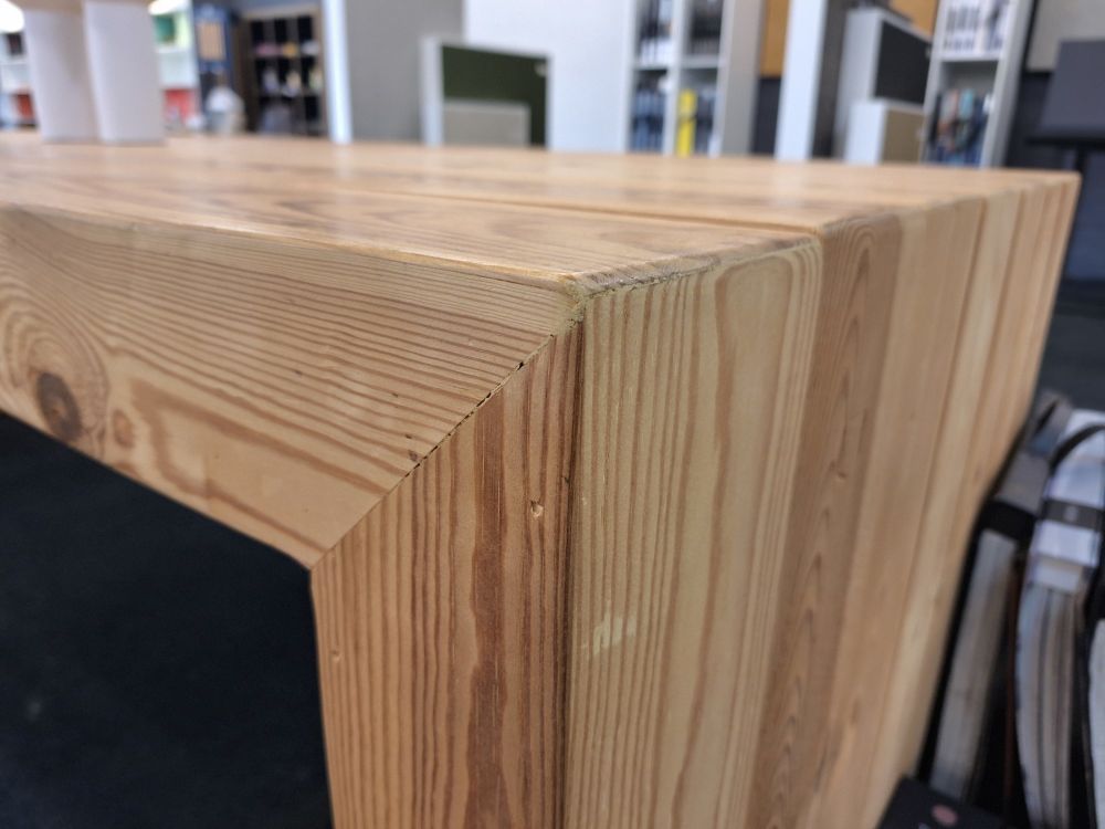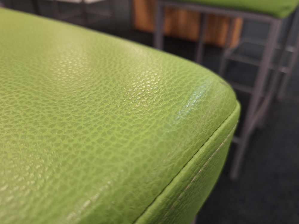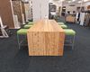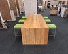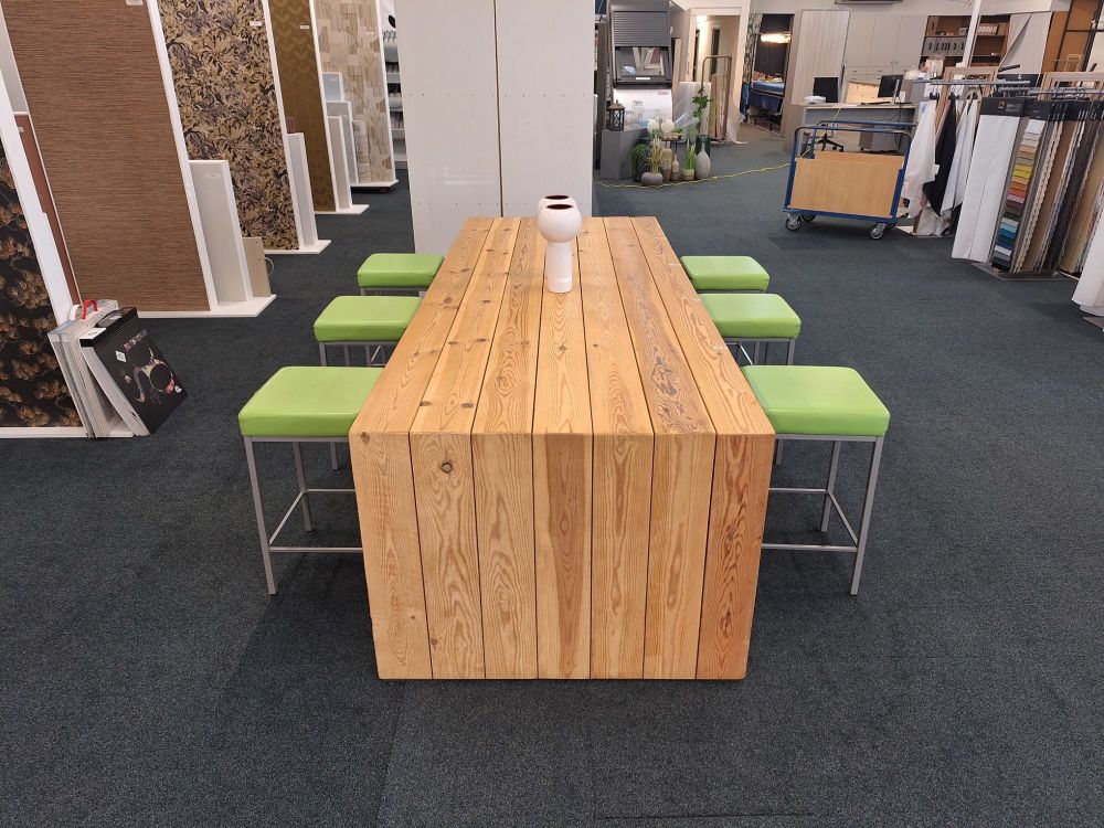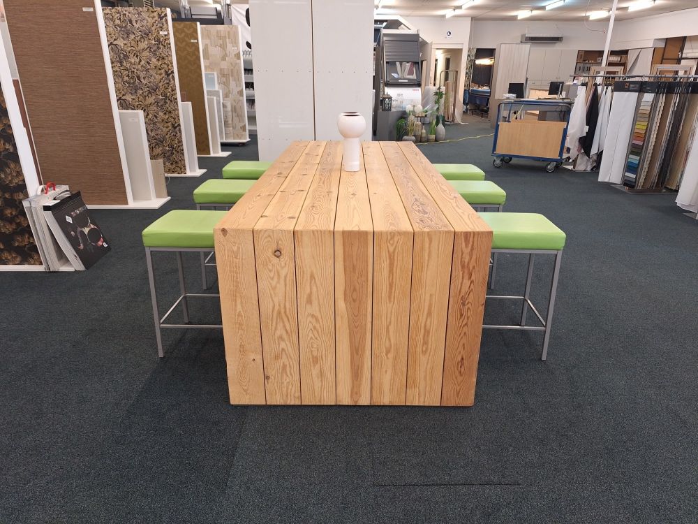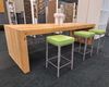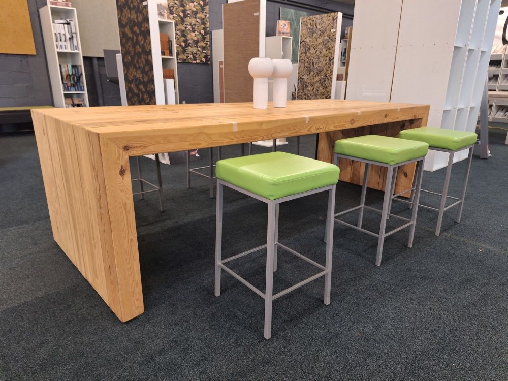 Massief houten tafel L260xB102xH79cm + 6 krukjes bekleed met groen imitatieleder