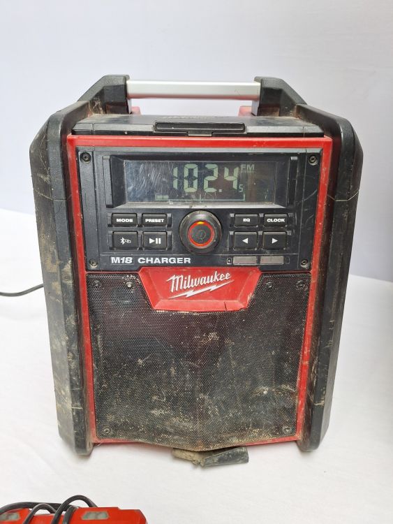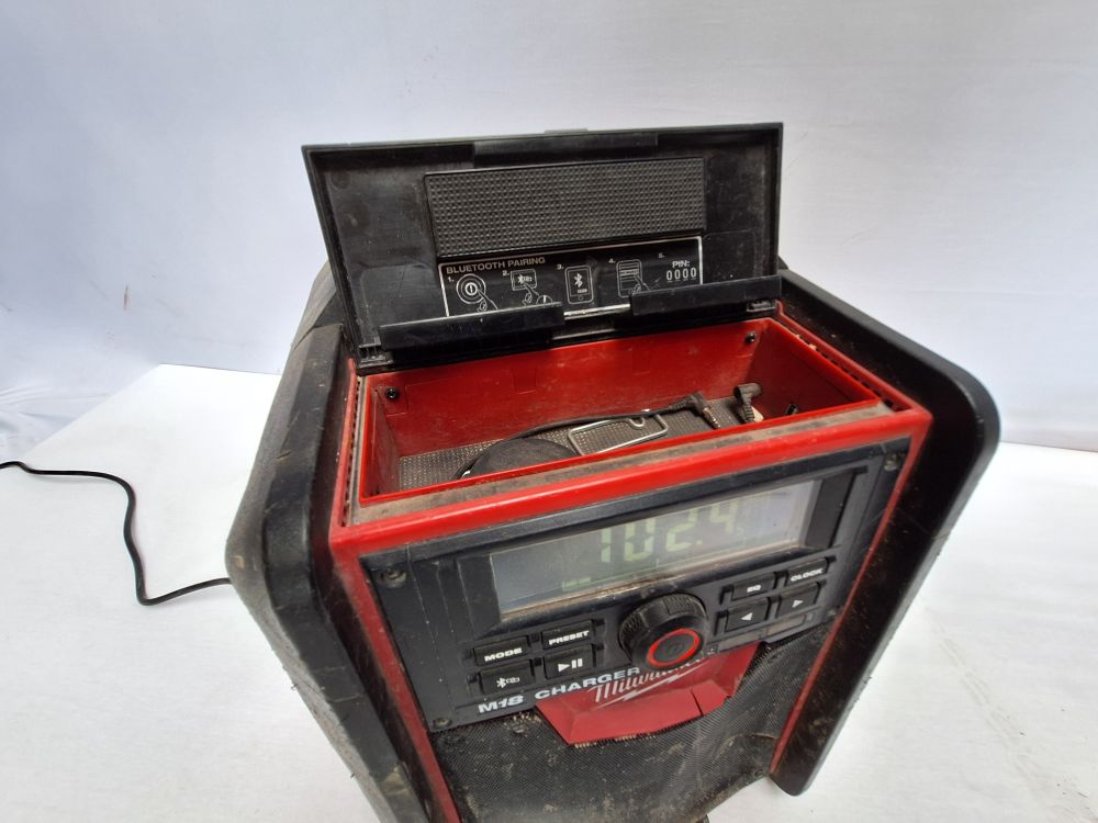 Bouwradio: Milwaukee M18 RC (Radio + Charger). Voorzien van Bluetooth, FM/AM ontvangst en geïntegreerde oplaadfunctie voor M18 accu's.