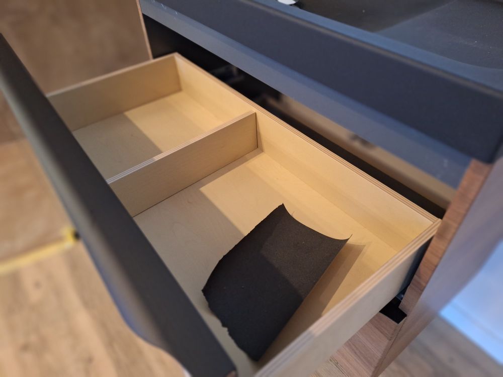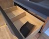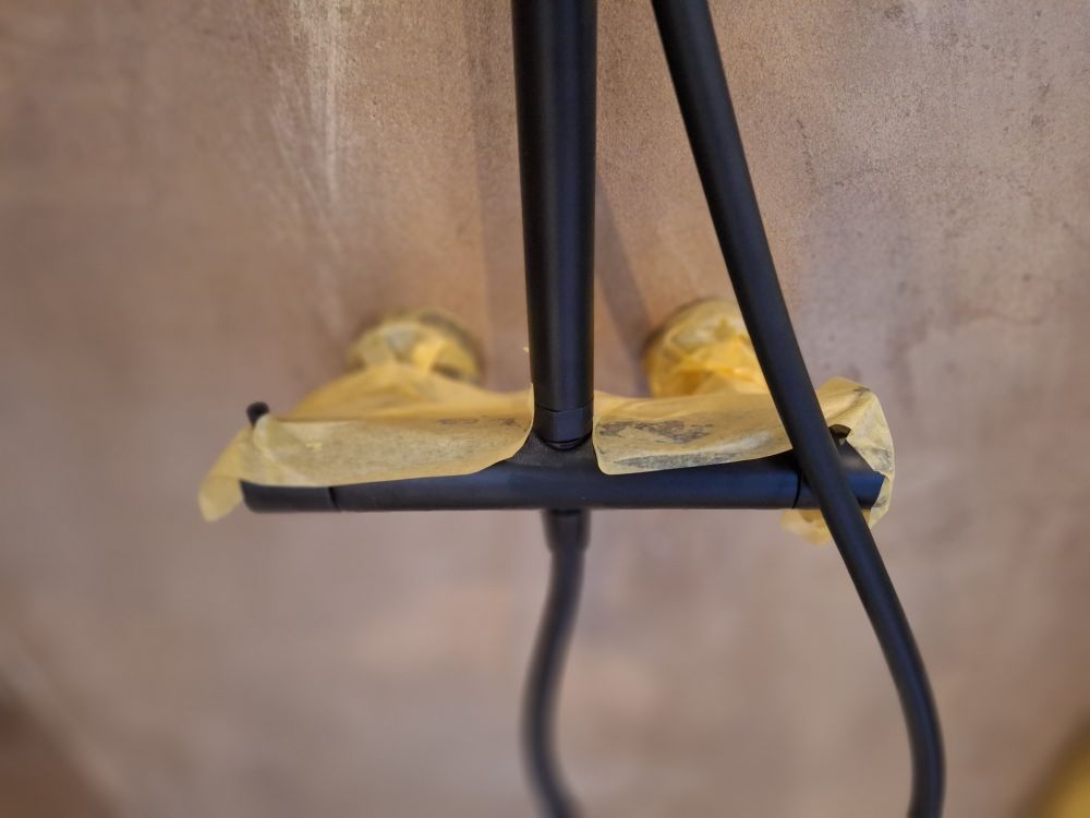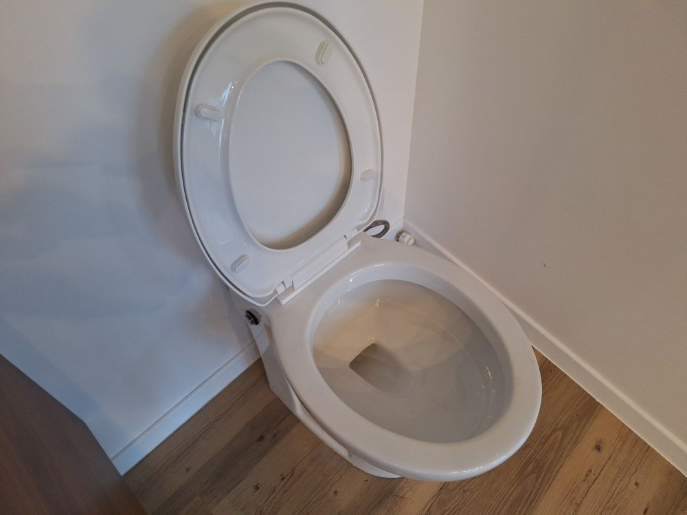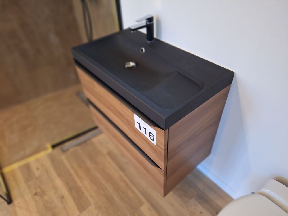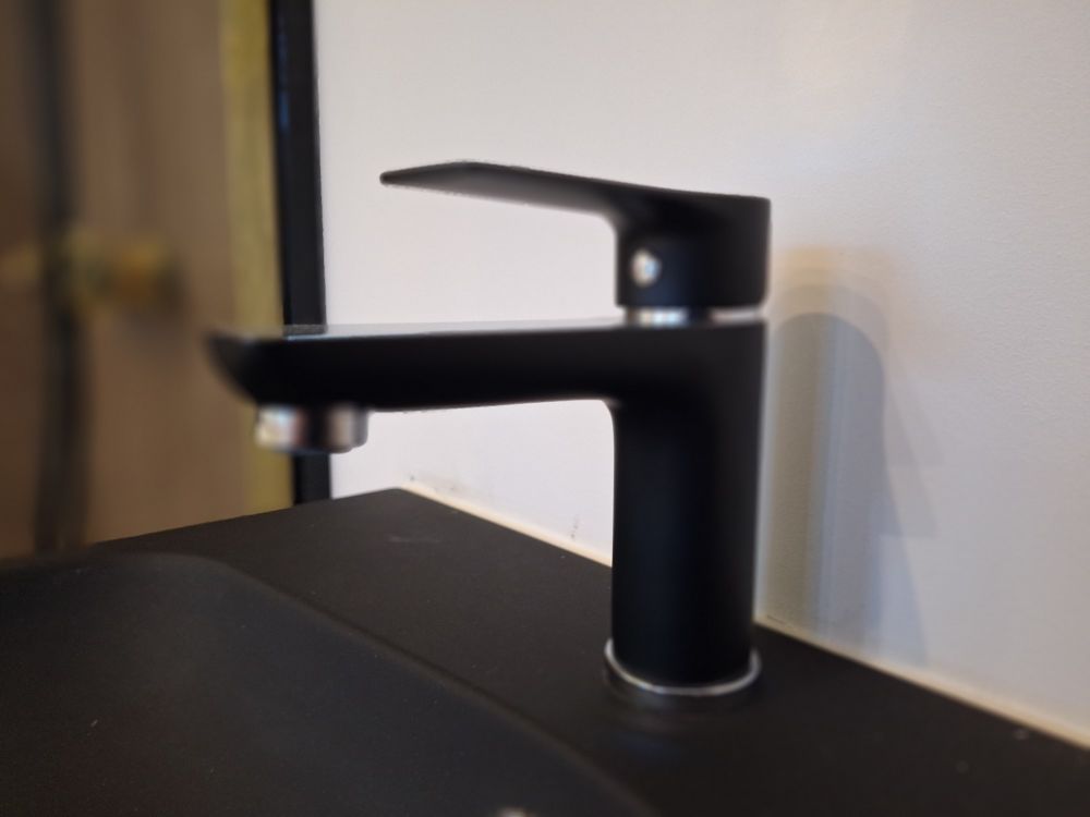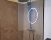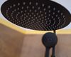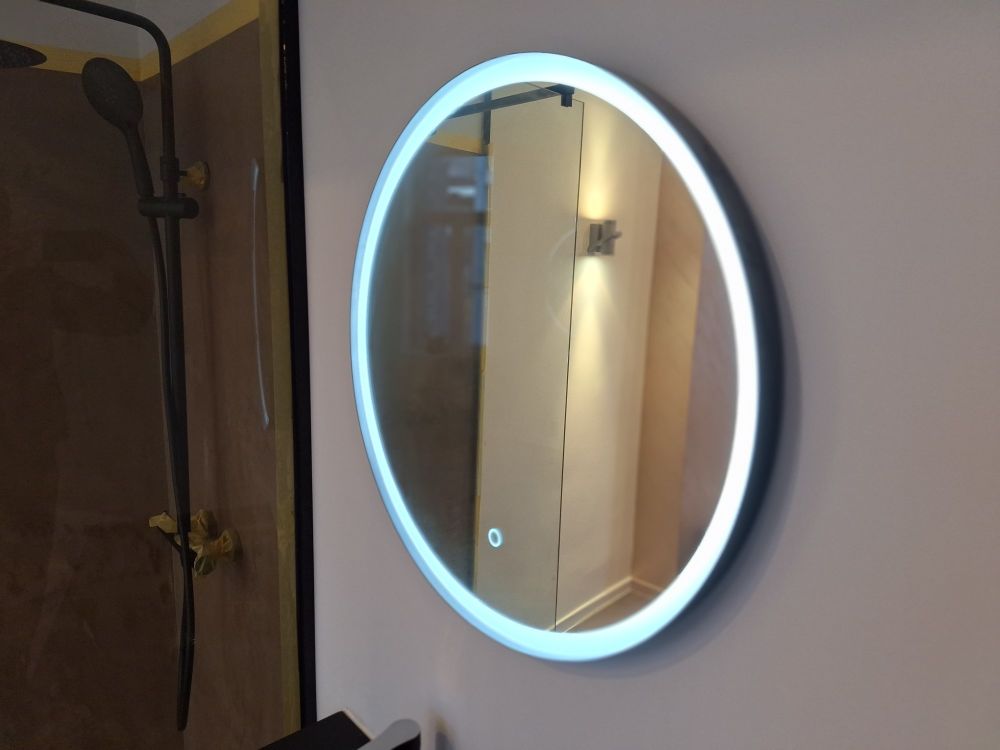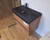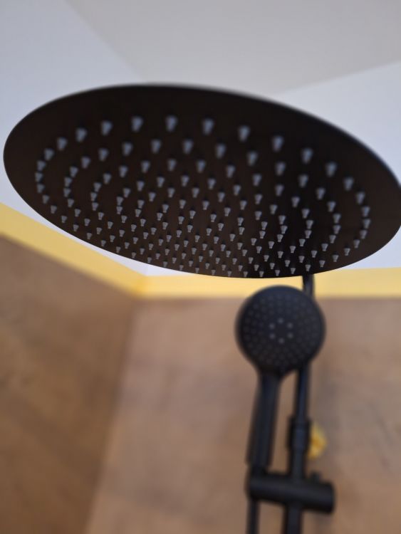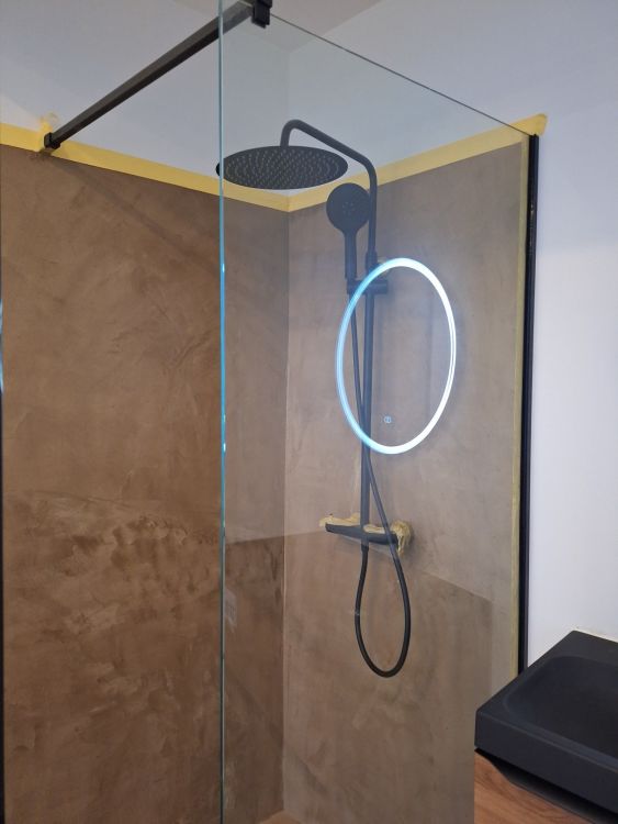 + Inloopdouche met matzwarte regendouche + handdouche – glazen scheiding + Wastafelmeubel met zwart blad + geïntegreerde waskom – houten onderbouw met 2 lades + Matzwarte kraan – cilindrisch design met vlakke hendel, passend bij de douchekoppen + Rond LED-spiegel – wandgemonteerd, met indirecte verlichting voor sfeer en functionaliteit + Toilet met gesloten deksel – glazen box met zwarte omlijsting