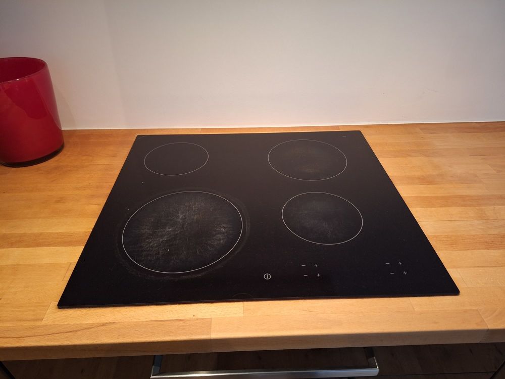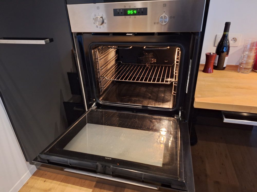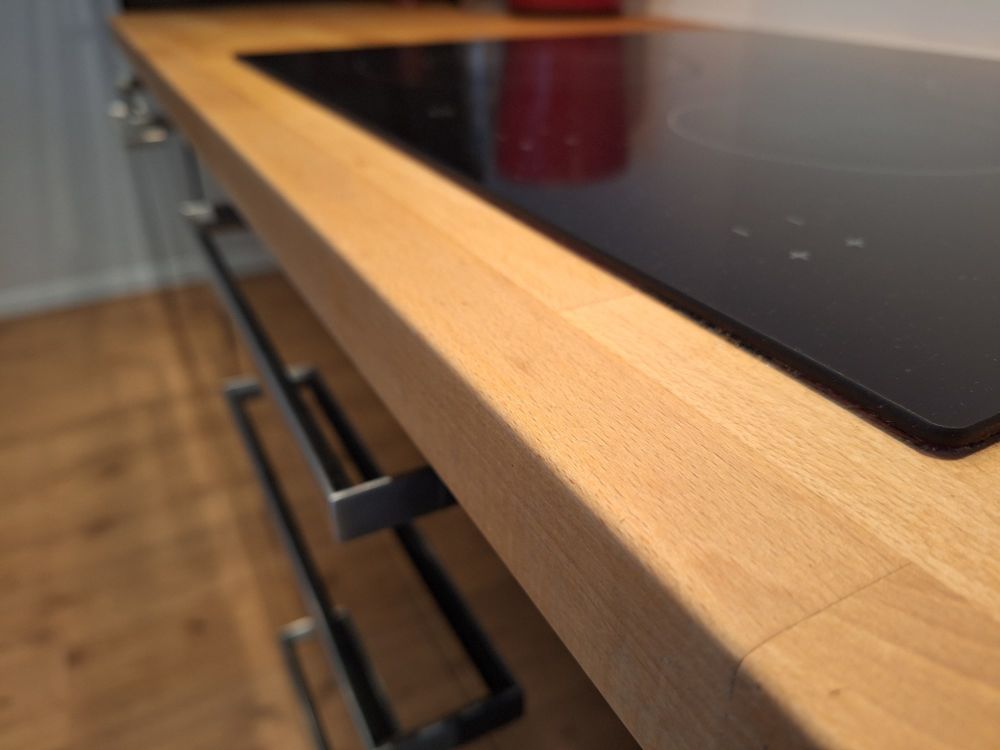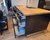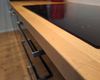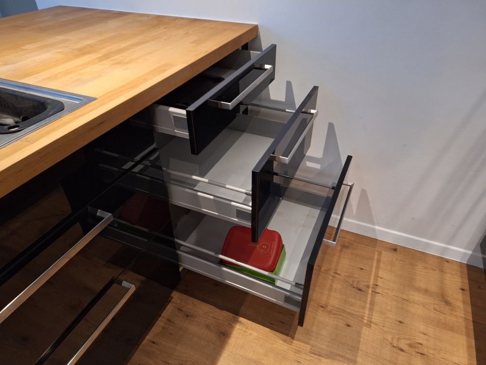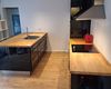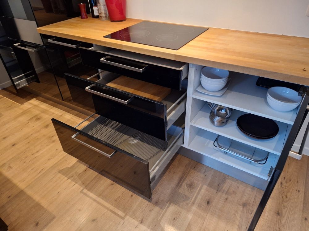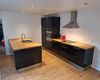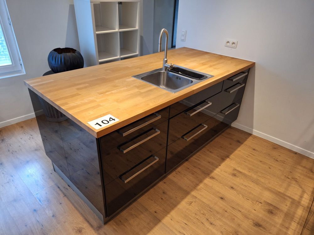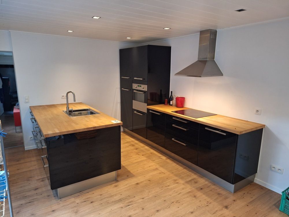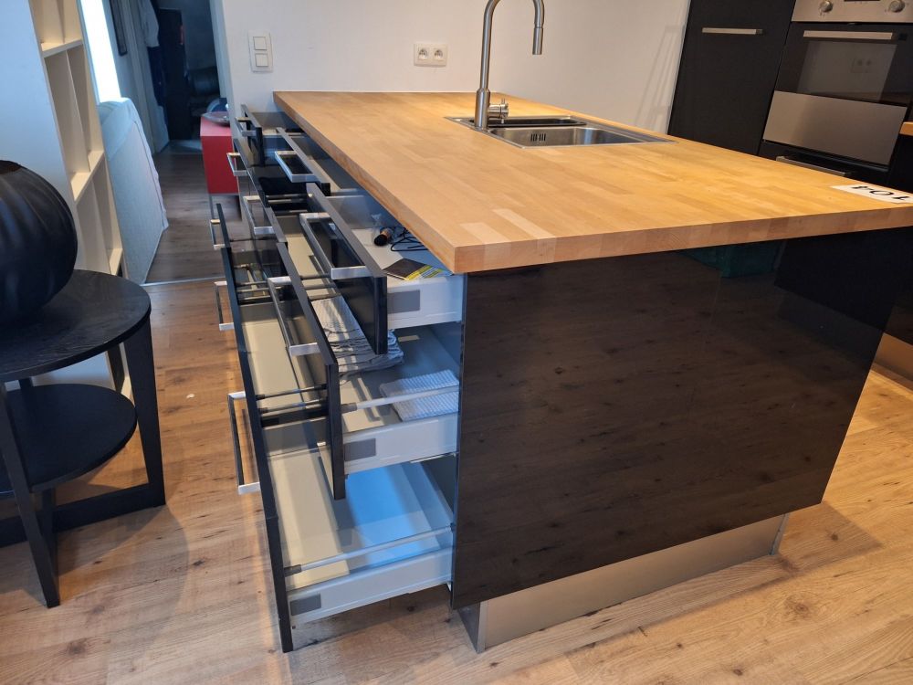 Keukeneiland met houten werkblad en ingebouwde RVS spoelbak – inclusief kraan met draaibare uitloop + Onderbouw in zwart glanzend front – met metalen grepen en ruime lades + Ingebouwde kookzone: glaskeramische kookplaat met 4 zones en touchbediening – visueel gecontroleerd + Wandopstelling met houten werkblad en zwarte onderkasten – inclusief IKEA dampkap met 3 standen en verlichting + Extra: wandkast met oven + microgolf, stopcontacten, spots, wandplank en decoratieve elementen inbegrepen