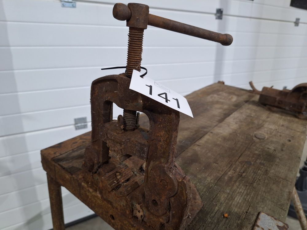 Bevestigde Klem 1:Pijpenklem / buizenklem (links op de bank). Zwaar gietijzeren model met grote spindel en handvat.