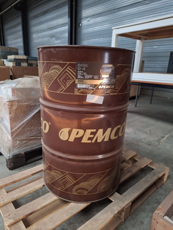 Vat van 208 liter PEMCO iDRIVE 4 C-4 / DIESEL G-4 motorolie, SAE 15W-40 SHPD. Geschikt voor vrachtwagens en dieselmotoren, voldoet aan o.a. API CI-4 Plus, ACEA E7, MB 228.3, Volvo VDS-3 en andere zware toepassingen. Industriële kwaliteit, Made in EU.
