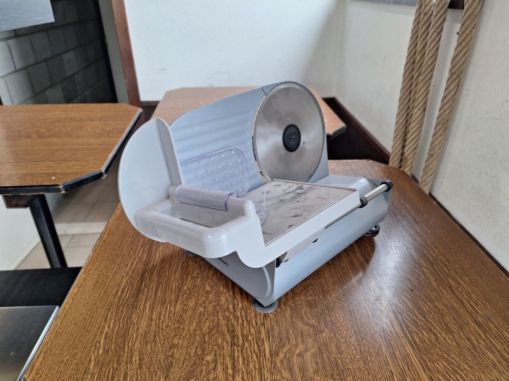 Kenmerken: Traploos instelbare snijdikte (0-15 mm), voorzien van zuignapvoetjes voor stabiliteit.