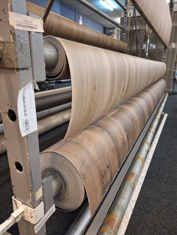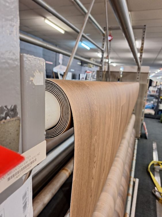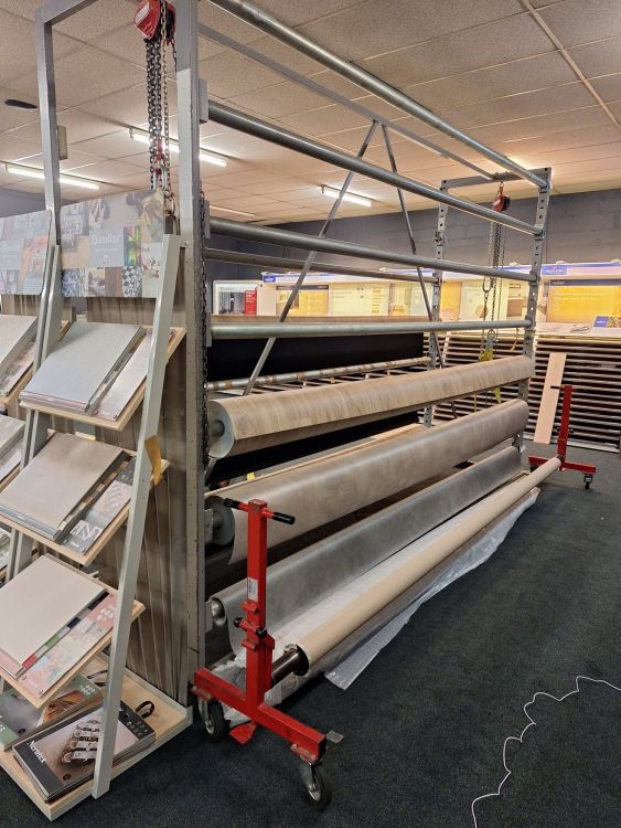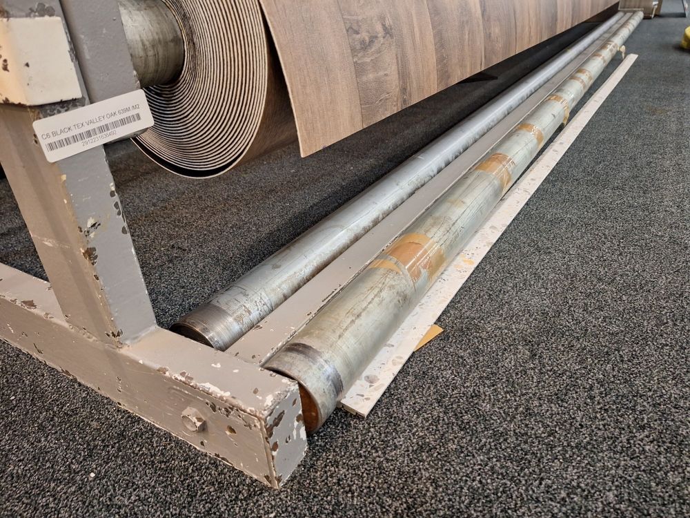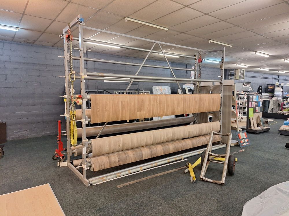 Inhoud van dit lot: de volledige metalen rek met inhoud(rollen vinyl,katrollen,rollen steekkar,spanbanden en rollentrolley (zie afbeeldingen)