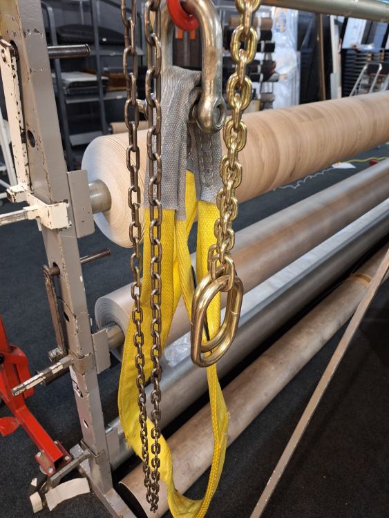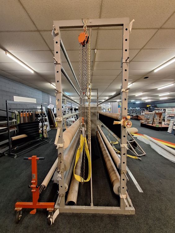 | Naam: | Professionele vloerrollenhouder met kettingtakel,spanbanden,rollen steekkar Incl.inhoud |