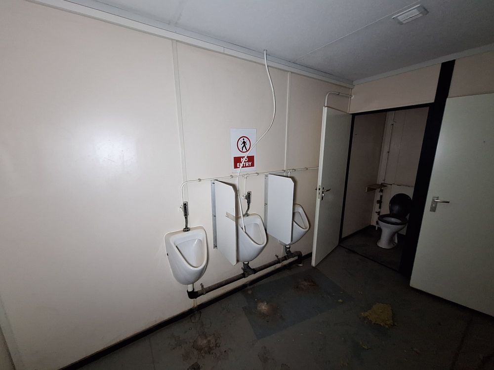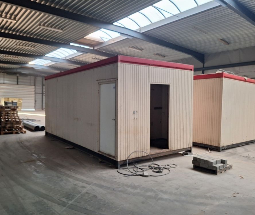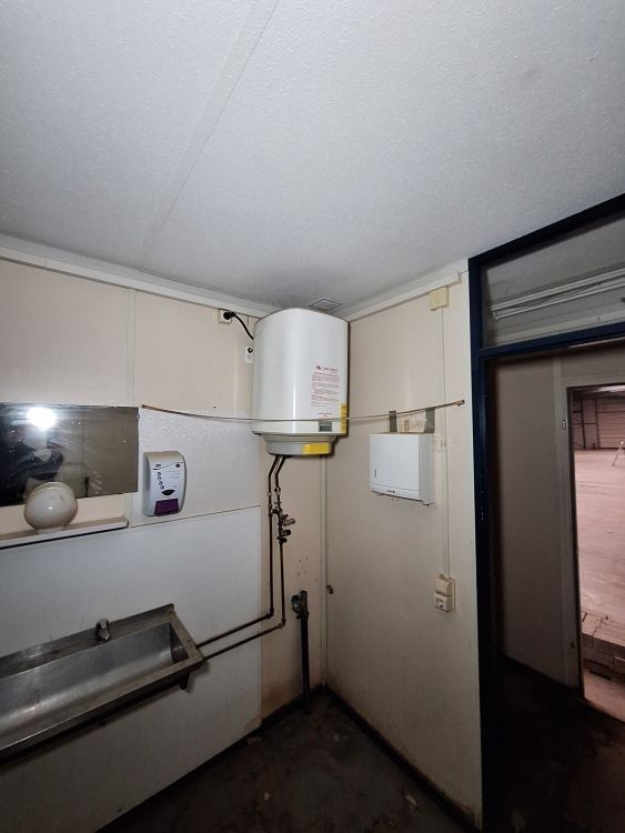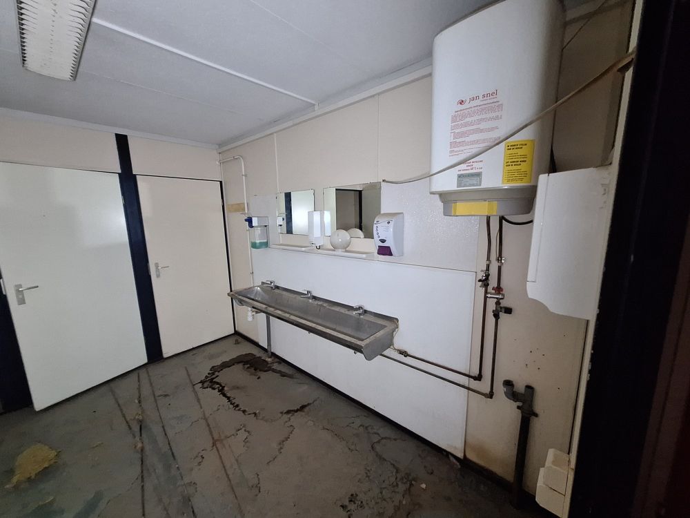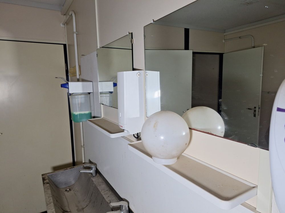 Functionele sanitaire unit met meerdere compartimenten, voorzien van toilet, urinoirs, inox wasbakken met kranen, spiegels, zeepdispensers en elektrische boiler. Ideaal voor werf, magazijn of tijdelijke accommodatie. Zichtbare gebruikssporen