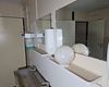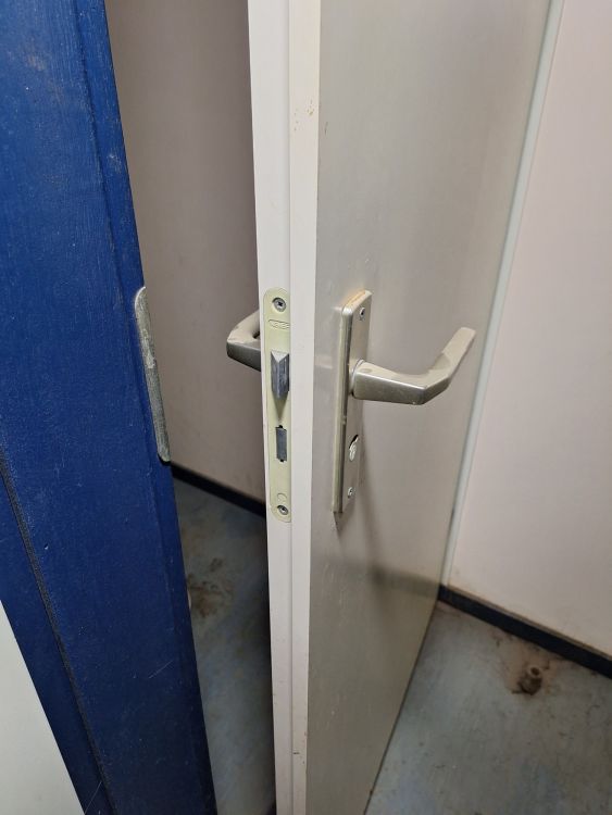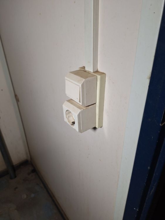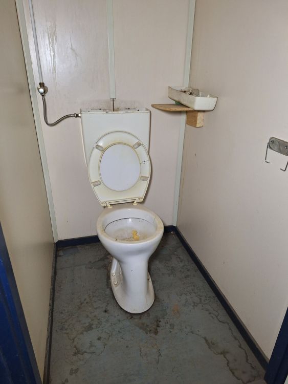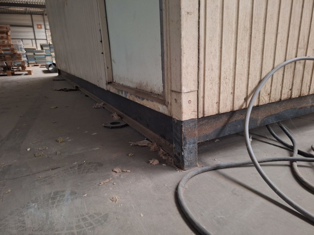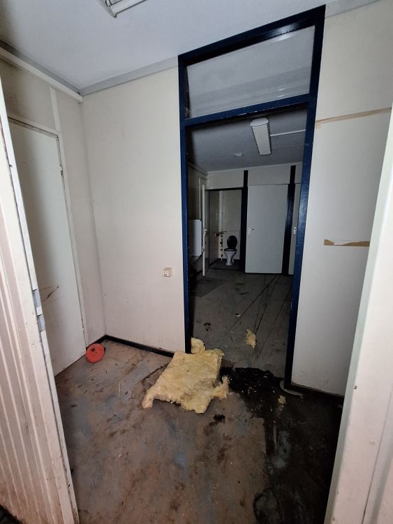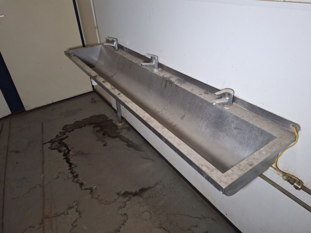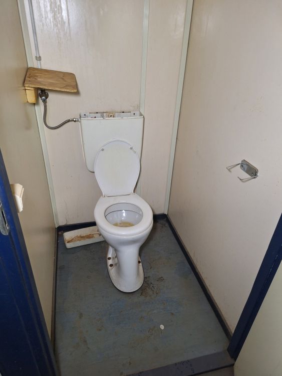Functionele sanitaire unit met meerdere compartimenten, voorzien van toilet, urinoirs, inox wasbakken met kranen, spiegels, zeepdispensers en elektrische boiler. Ideaal voor werf, magazijn of tijdelijke accommodatie. Zichtbare gebruikssporen
