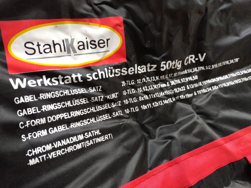 Materiaal: Chroom vanadium-staal, mat verschroomd Starter (s) sleutels, Halve maansleutels, extra korte sleutels, normale sleutels. Etui kan opgehangen worden. - 20 x ring steek sleutel: metrisch: 10, 11, 12, 13, 14, 15, 16, 17, 18, 19 mm Inch: 1/4", 5/16", 3/8", 7/16", 1/2", 9/16", 5/8", 11/16", 3/4", 7/8 " - 10 x starter- / bloksleutel: metrisch: 8 x 10, 11 x 13, 14 x 15, 17 x 19, 21 x 22 mm Inch: 5/16" x 3/8", 7/16" x 1/2", 9/16" x 5/8", 11/16" x 3/4", 13/16" x 7/8 " - 10 x halve maan -dubbele ringsleutel ( ring - ring) metrisch: 10 x 11, 12 x 13, 14 x 15, 16 x 17, 18 x 19 mm Inch: 3/8" x 13/32", 7/16" x 1/2", 9/16" x 19/32", 5/8" x 11/16", 11/16" x 3/4 " - 10 extra korte(stubby) ring-steeksleutel: metrisch: 10, 12, 13, 14, 17 mm Inch: 3/8", 7/16", 1/2", 9/16", 5/8 "