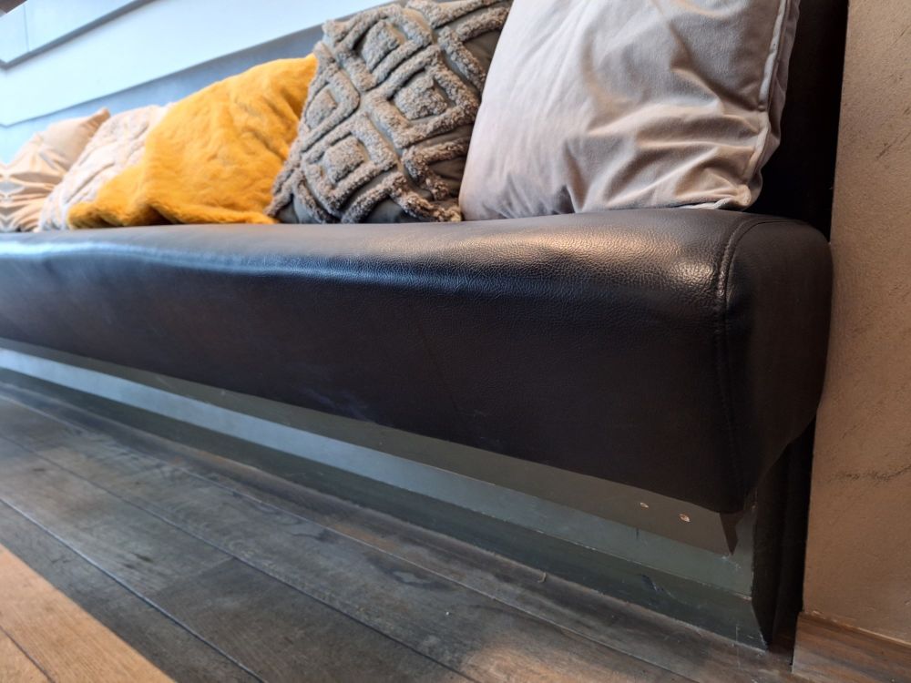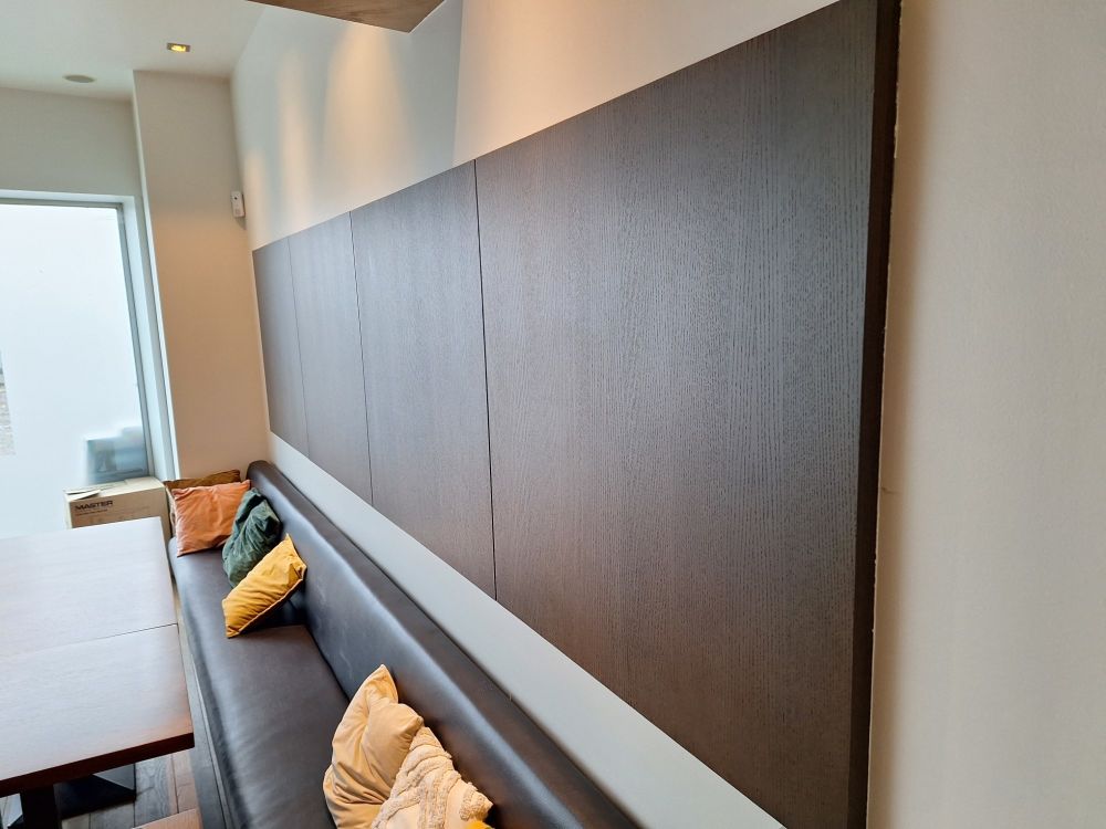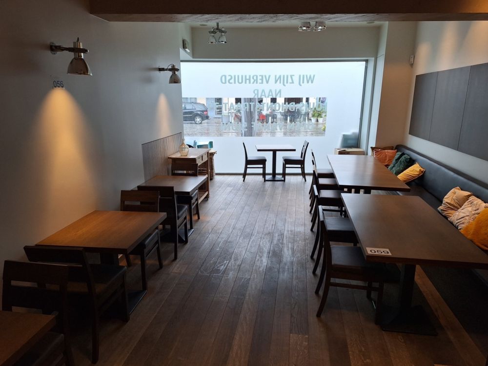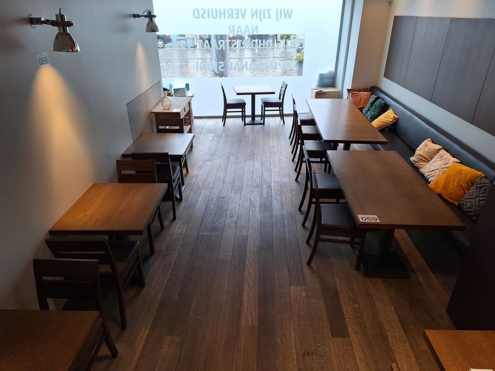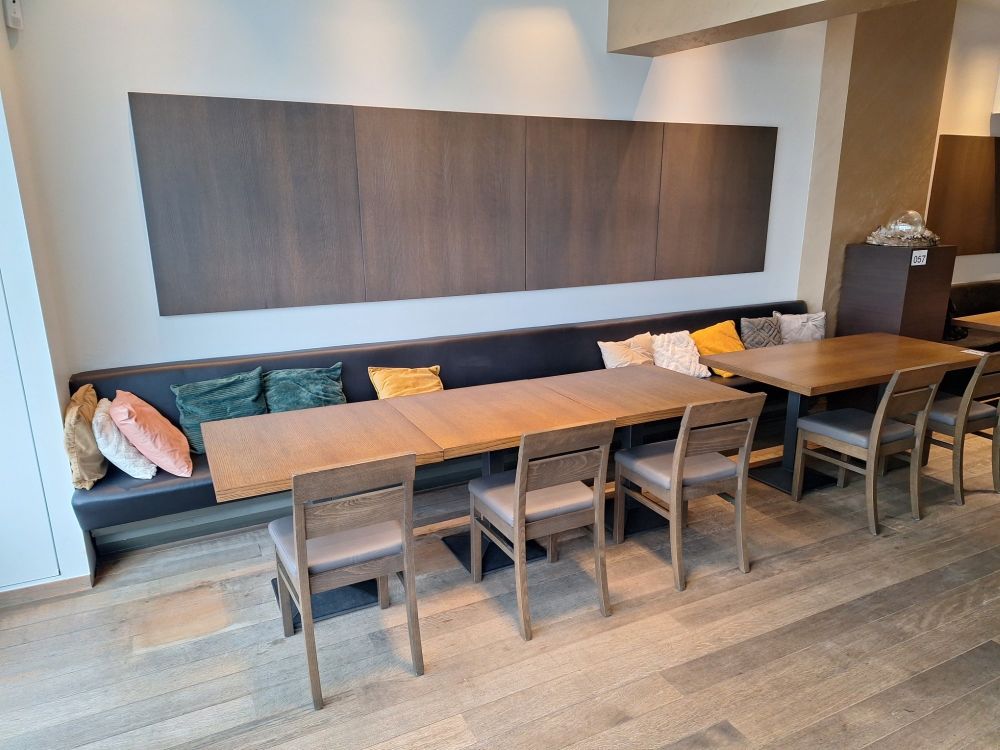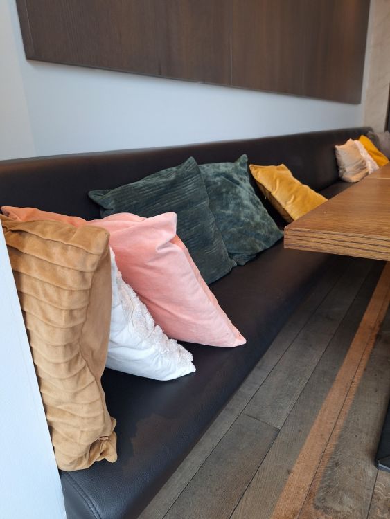 | Naam: | Stijlvolle horeca-opstelling bestaande uit zitbanken met decoratieve kussens, houten tafels en sfeervolle wandpanelen |
