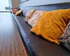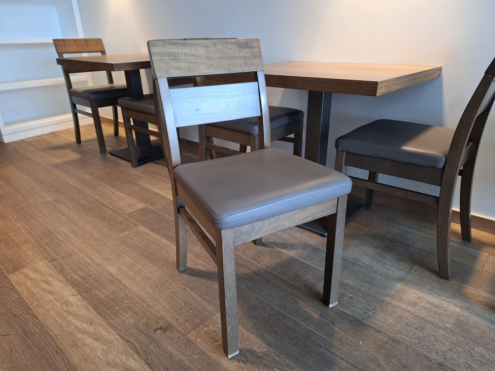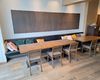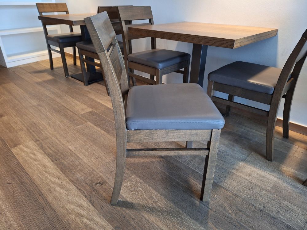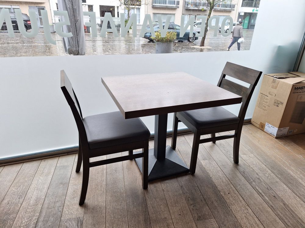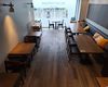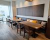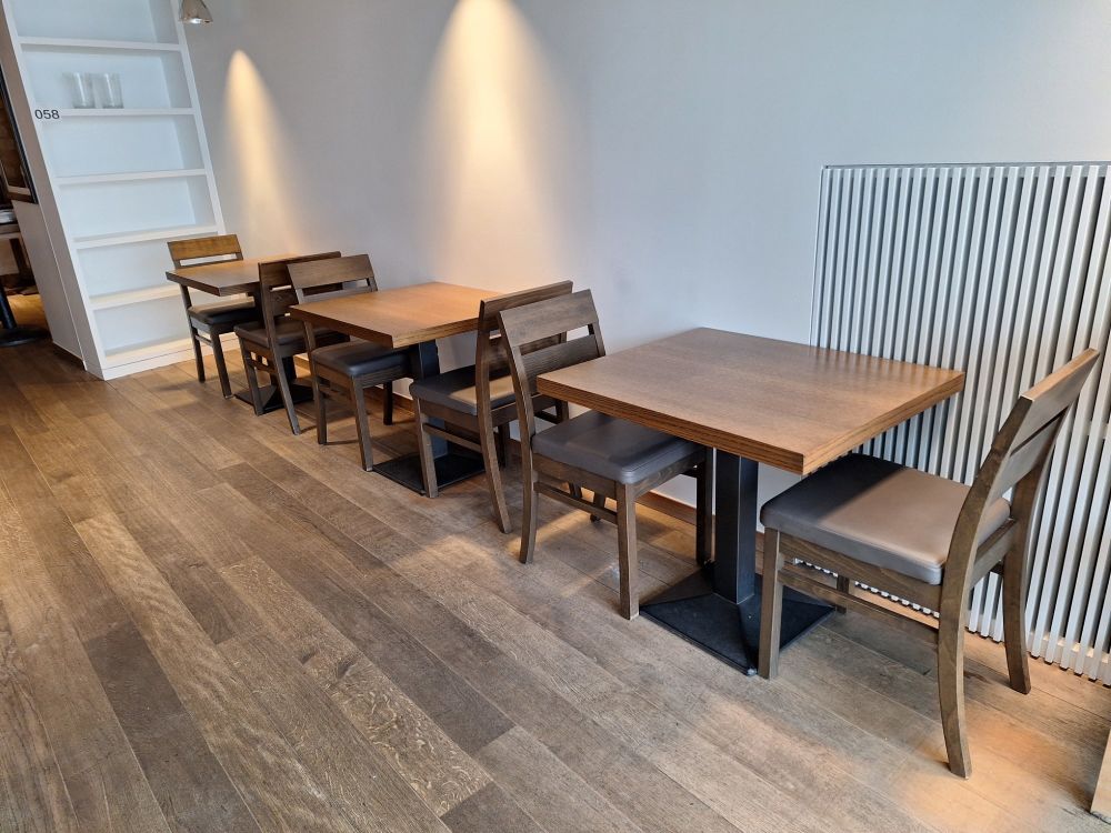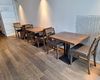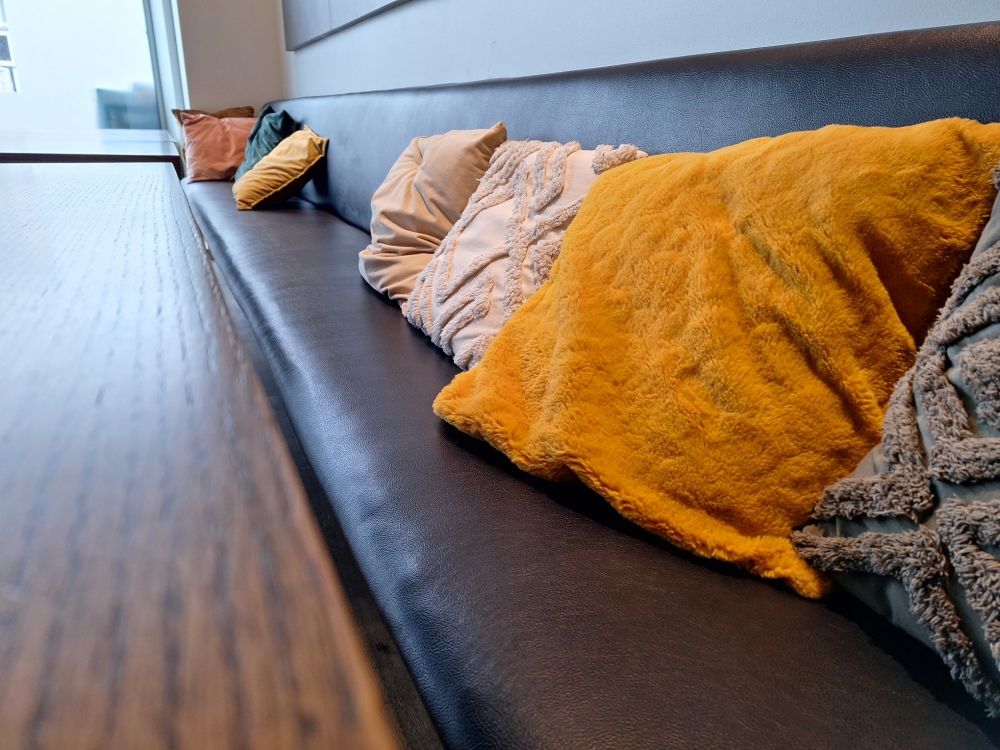 | Naam: | Stijlvolle horeca-opstelling bestaande uit zitbanken met decoratieve kussens, houten tafels en sfeervolle wandpanelen |