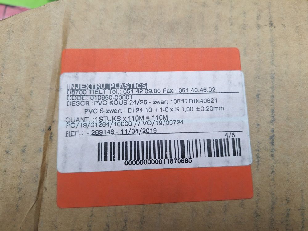 1 rol zwarte PVC beschermkous van 110 meter – type D4/26, hittebestendig tot 105°C, volgens DIN40621.