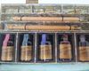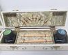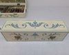 | Kist Afwerking | Crèmekleurige houten kisten met groen/blauw floraal patroon en messing beslag |