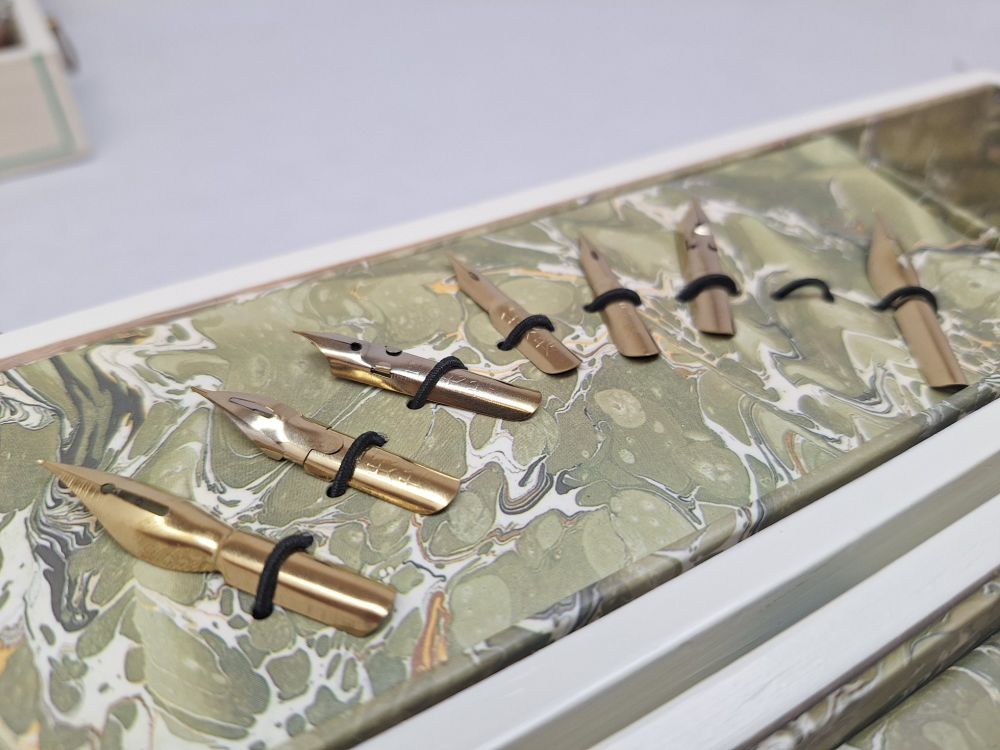 | Kleine Kist (Inhoud) | 2 grote inktpotten, 2 houten penhouders, 7 gouden penpunten |