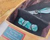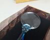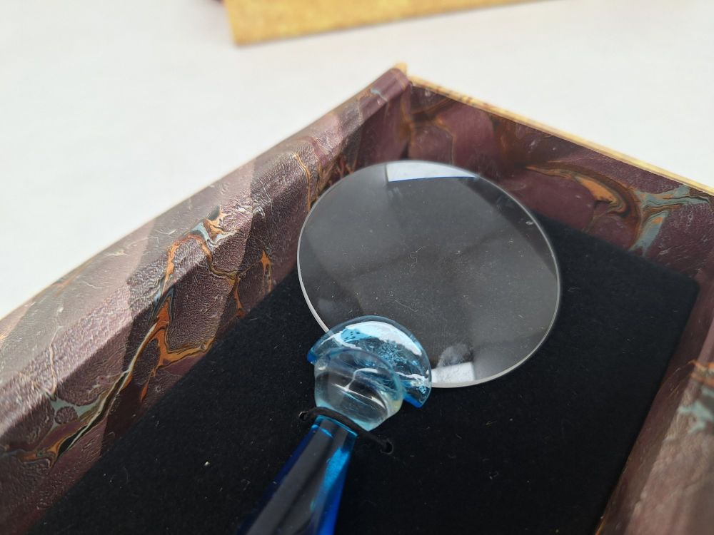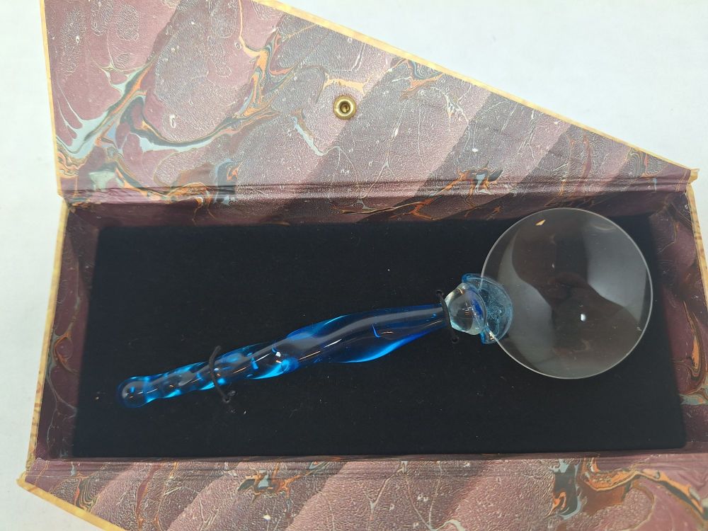 "Venice Magnifier": elegante loep met handgedraaid glazen handvat (blauw/getint), in bijpassende marmerpapier doos.