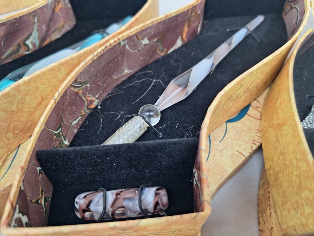 Meerdere "Pulcinella's Pen Set": sets met kleurrijke handgedraaide glazen dippennen (o.a. turquoise, wit/gemarmerd, groen), bijbehorende glazen pensteunen en kleine inktflesjes.