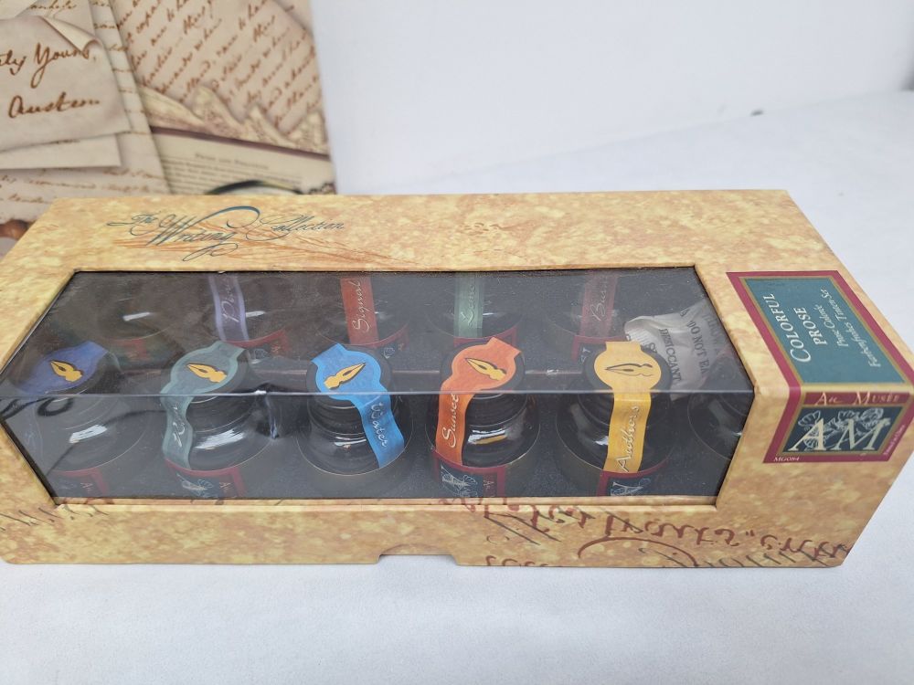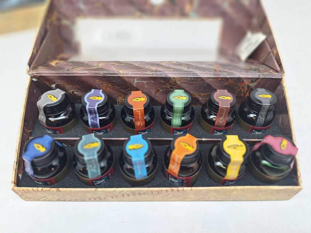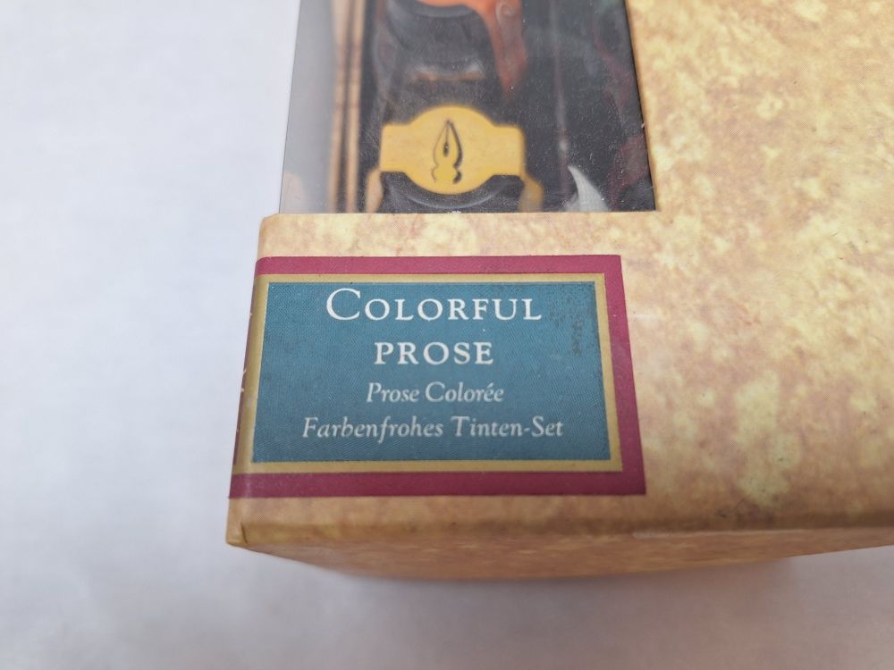 Luxe set "Colorful Prose" met 12 flesjes gekleurde inkt (diverse tinten blauw, groen, rood, geel, paars, oranje e.a.) in originele presentatiedoos.