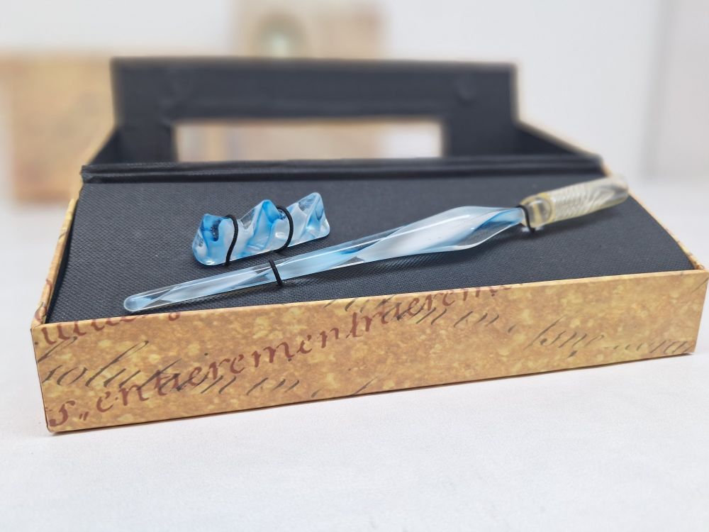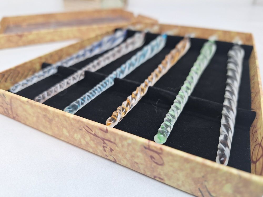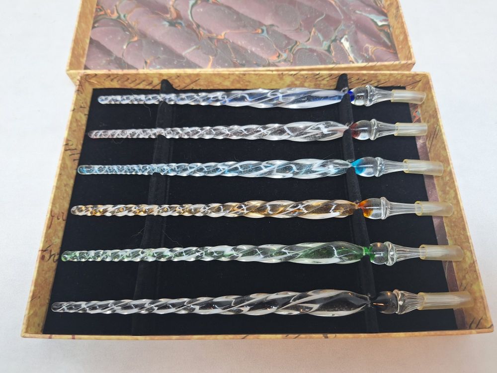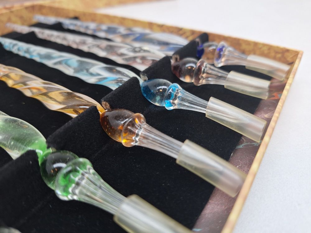 Set "San Marco Glass Stylus" met meerdere handgedraaide glazen dippennen in verschillende kleuren en patronen (inclusief blauwe, groene, oranje en transparante varianten).