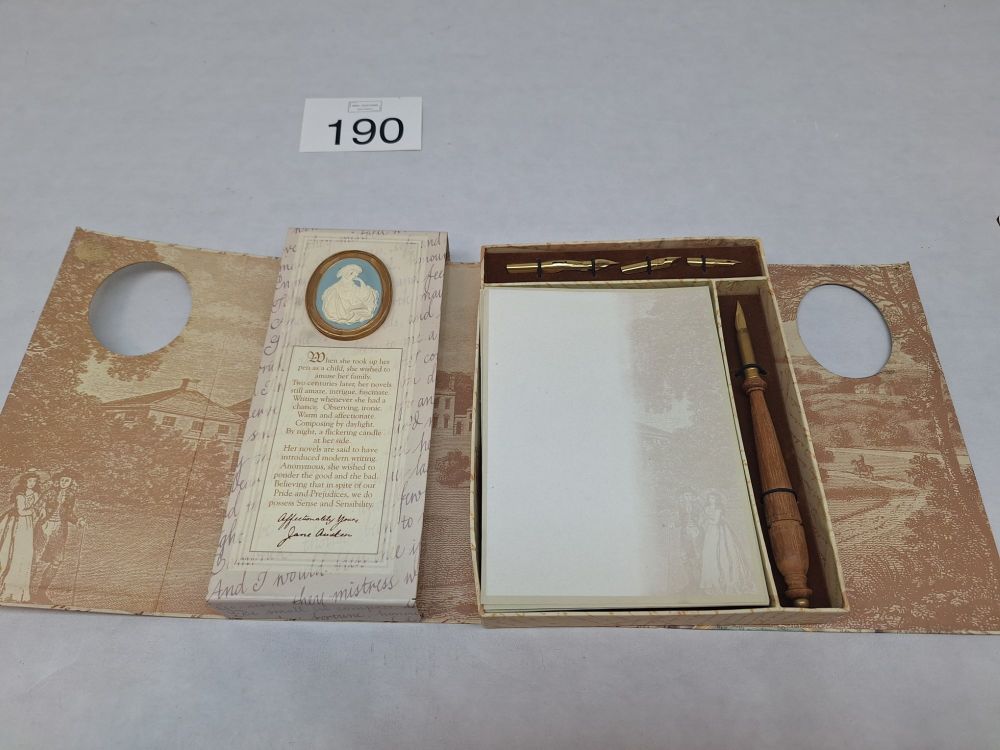Jane Austen-geïnspireerde set in elegante doos met houten veerpenhouder, messing nib, cameo-portret van Jane Austen en decoratieve brievenprint.