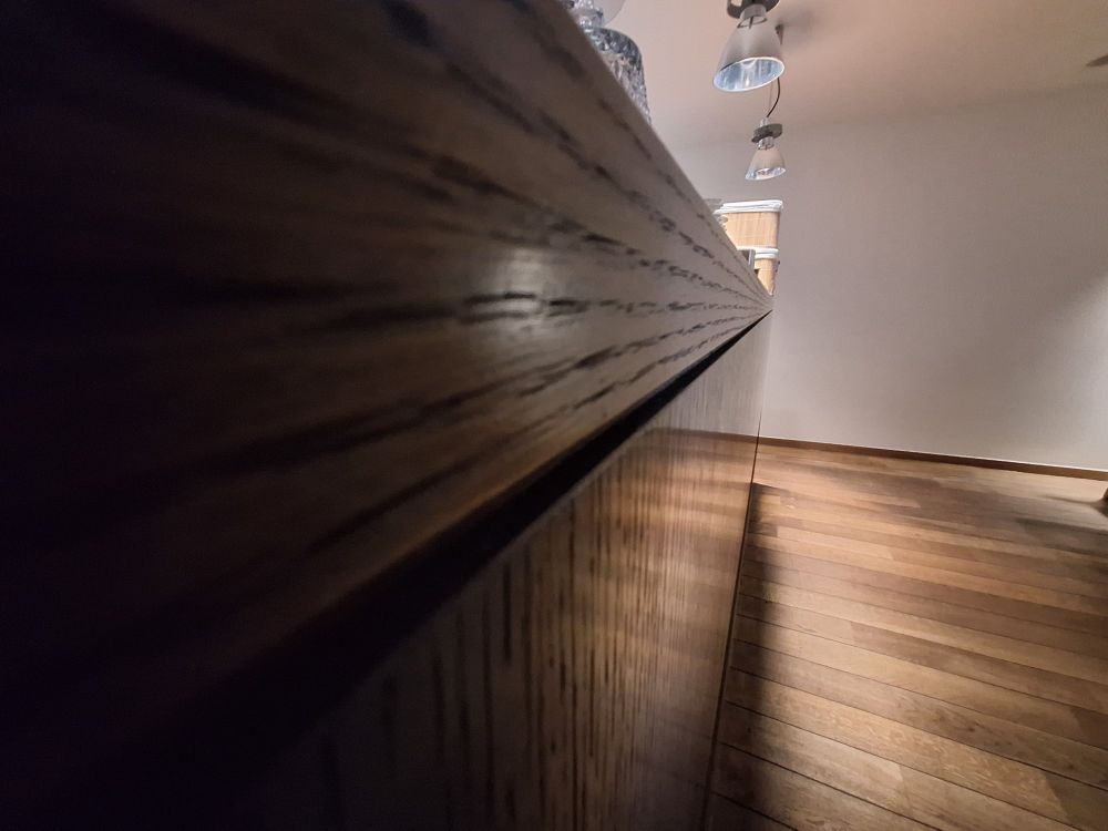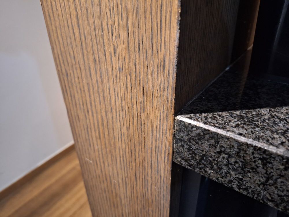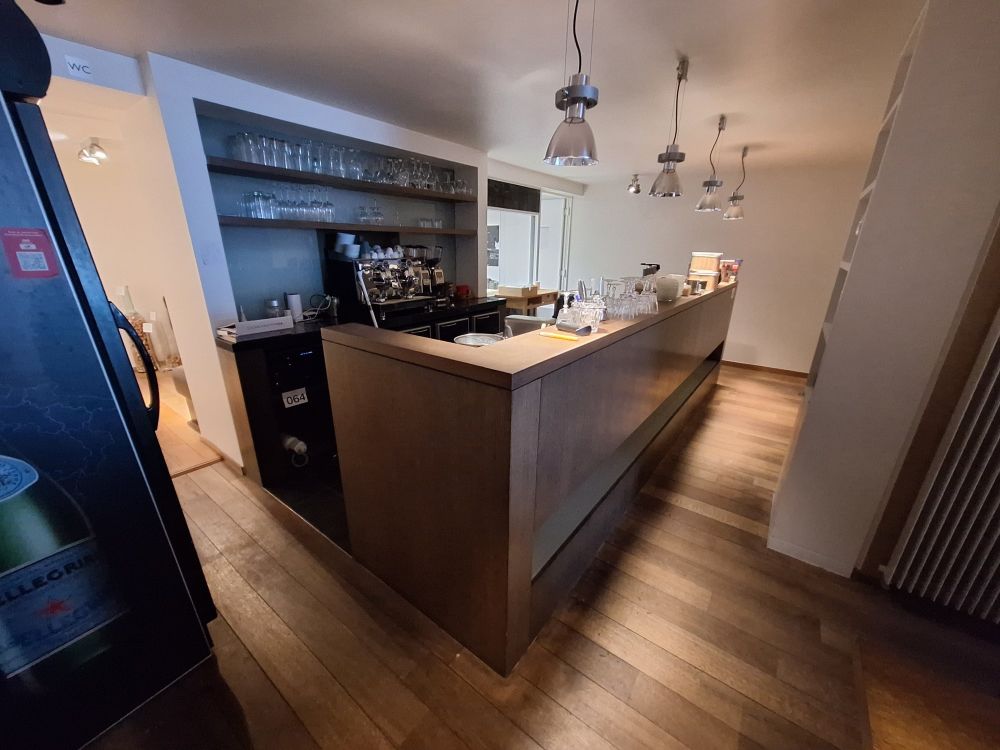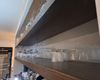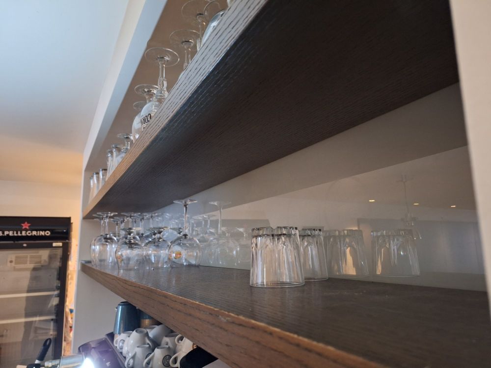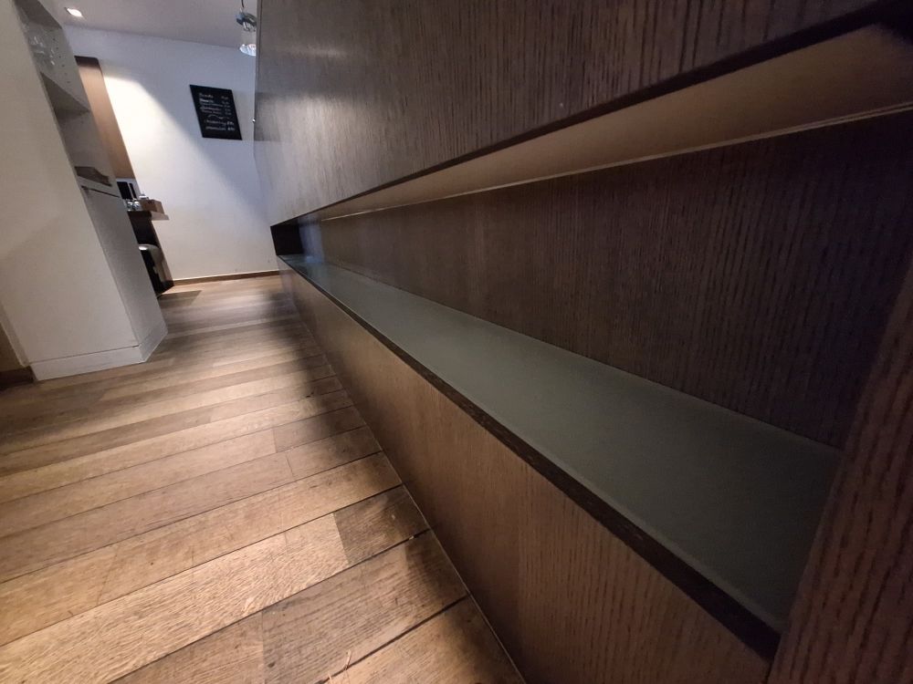 Achterwand bestaat uit 2 houten leggers met melkglas,bar eveneens met ingbouwde verlichting